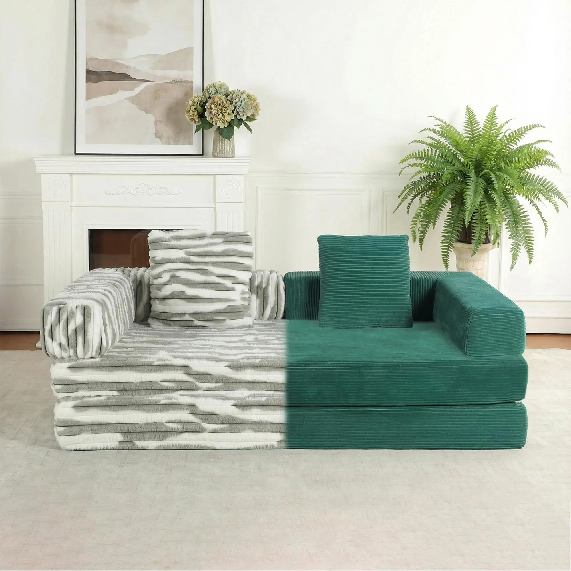 Came in two big packages, vacuum compressed. A bit wrinkled at first, but after I ironed it, it turned out perfect! Super soft, large, and really beautiful. You can use it as a sofa or put the pieces together as a bed. Love it!