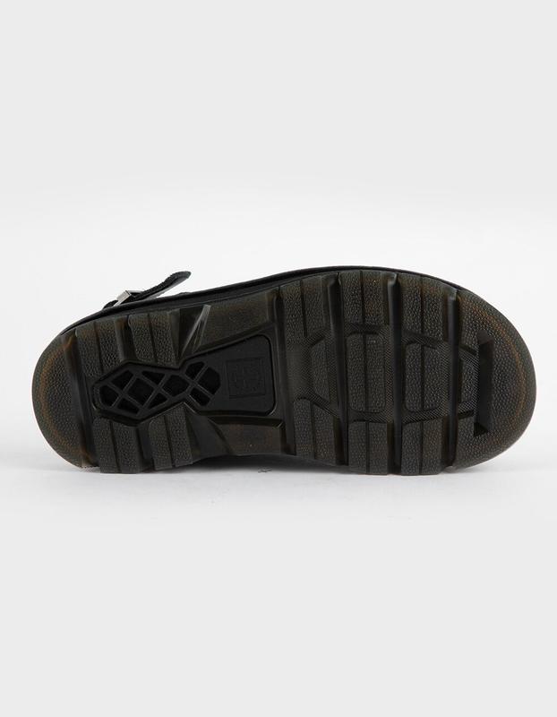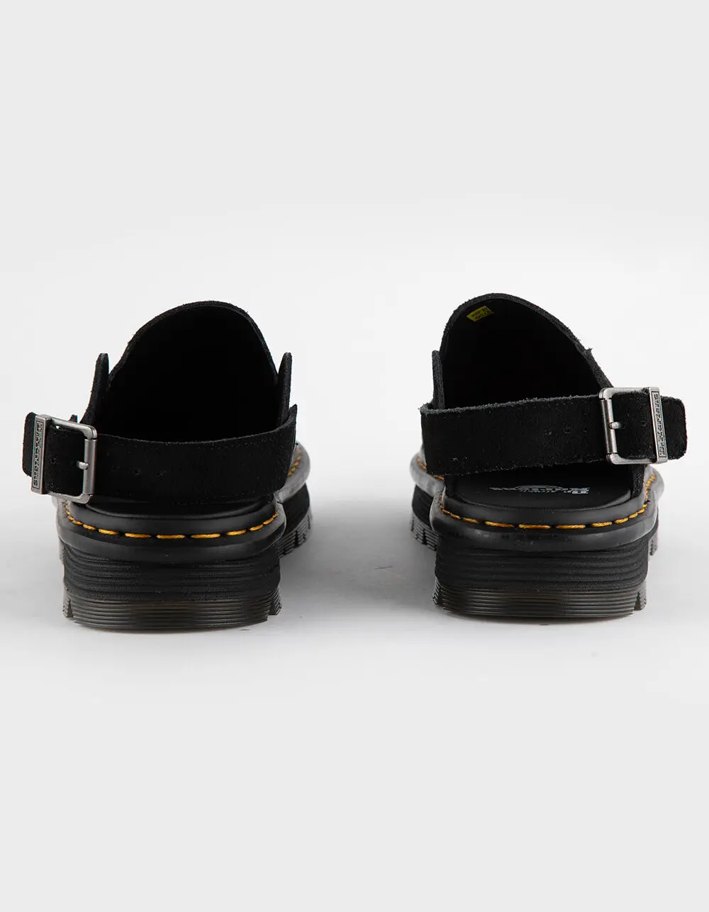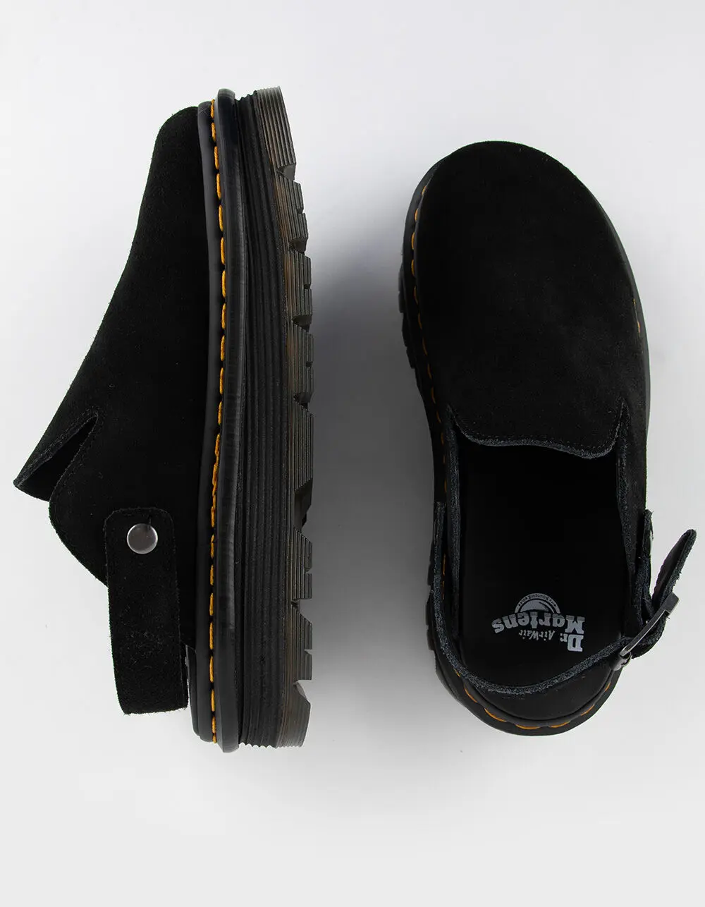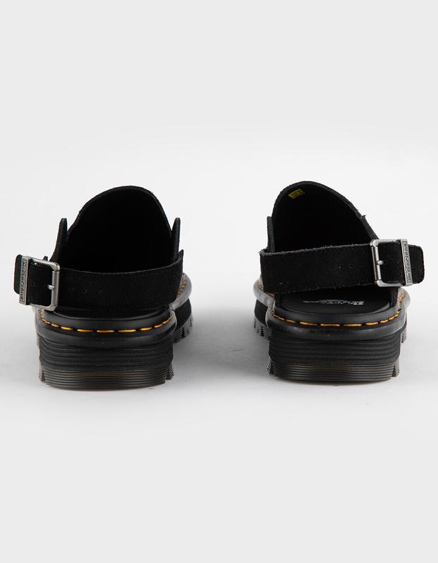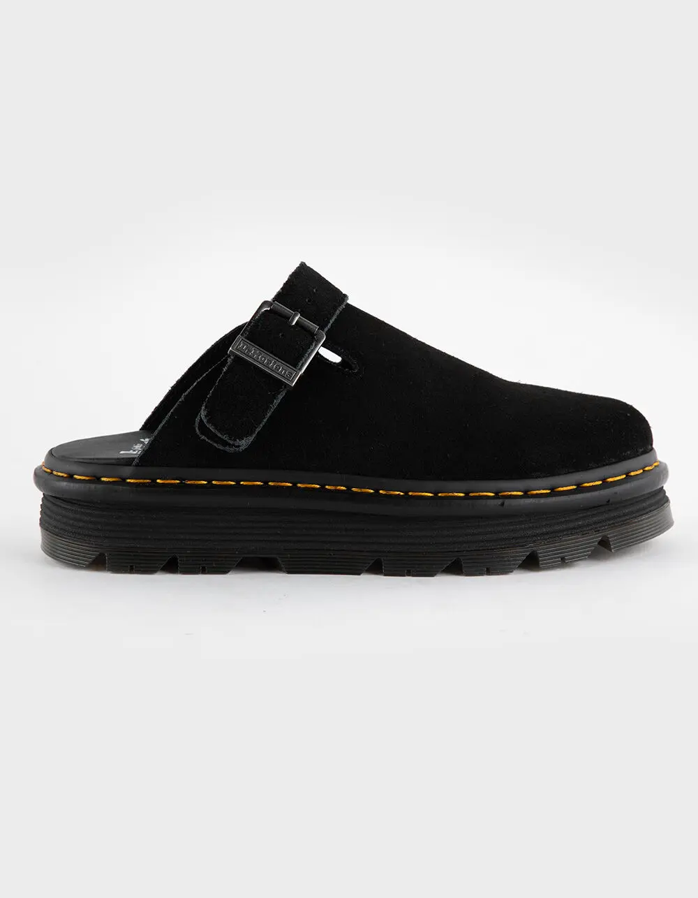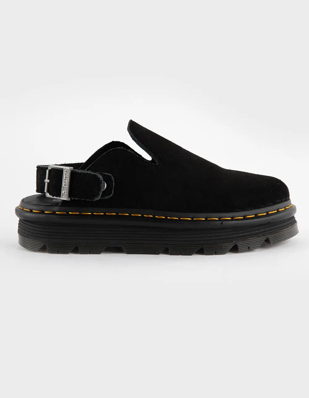 Dr. Martens Zebzag Mules. The Zebzag mule is our latest innovation in comfort: built on a hybrid air-cushioned sole that fuses feather-weight EVA with rugged PVC. Crafted from lightweight, versatile suede, they’re designed to be worn however you feel like – in summer or out of the conventional season. The adjustable strap ensures a secure fit, while the welted construction delivers our signature durability. Yellow welt stitching marks the mules as Dr. Martens. Platform height: 1 in; Heel height: 1 1/4 in. Wider and a more rounded toe shape. Clean by brushing with a suede or stiff bristle brush. Imported.