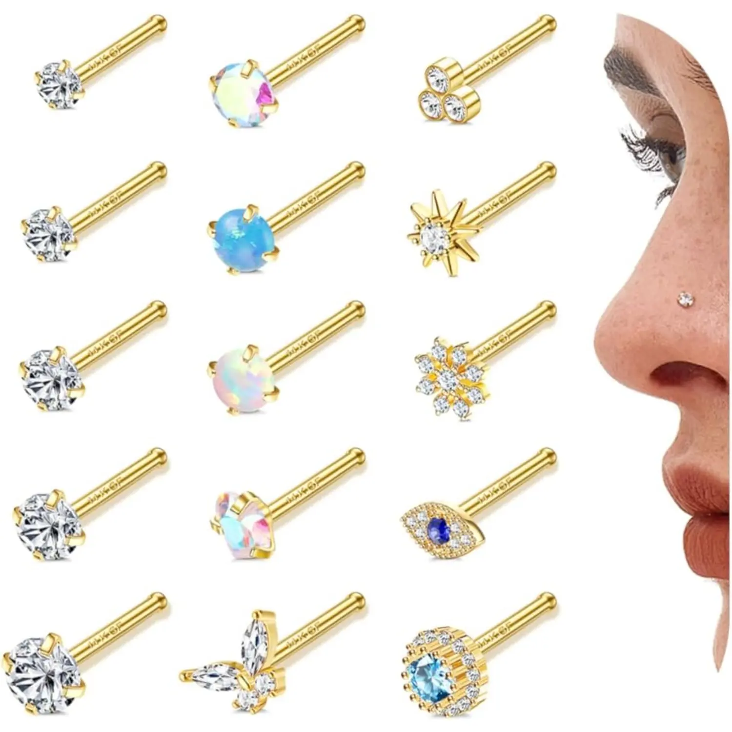 15Pcs 14K Gold Filled Nose Rings Studs 20G Surgical Stainless Steel L Shaped Nose Studs Genuine Opal CZ Nose Piercing Jewelry for Women Men