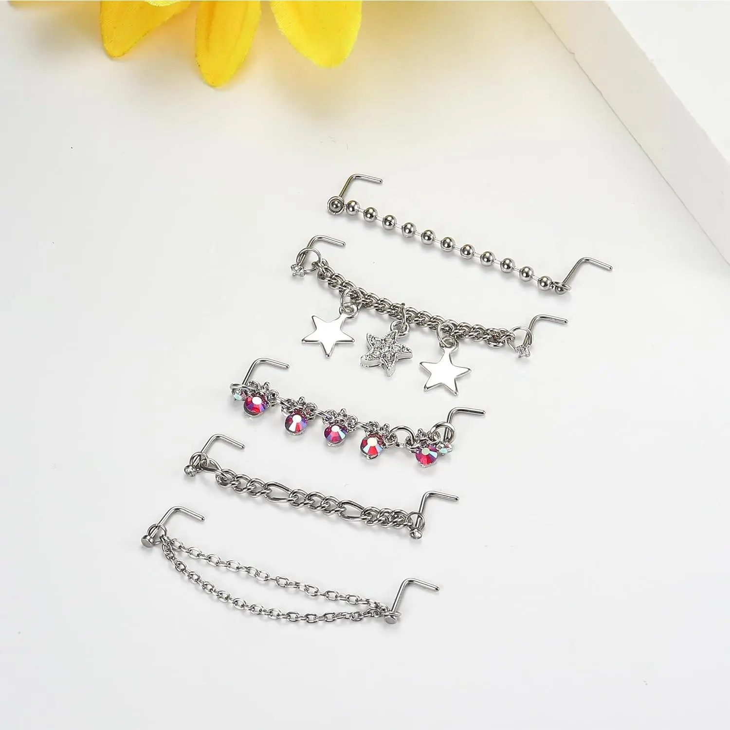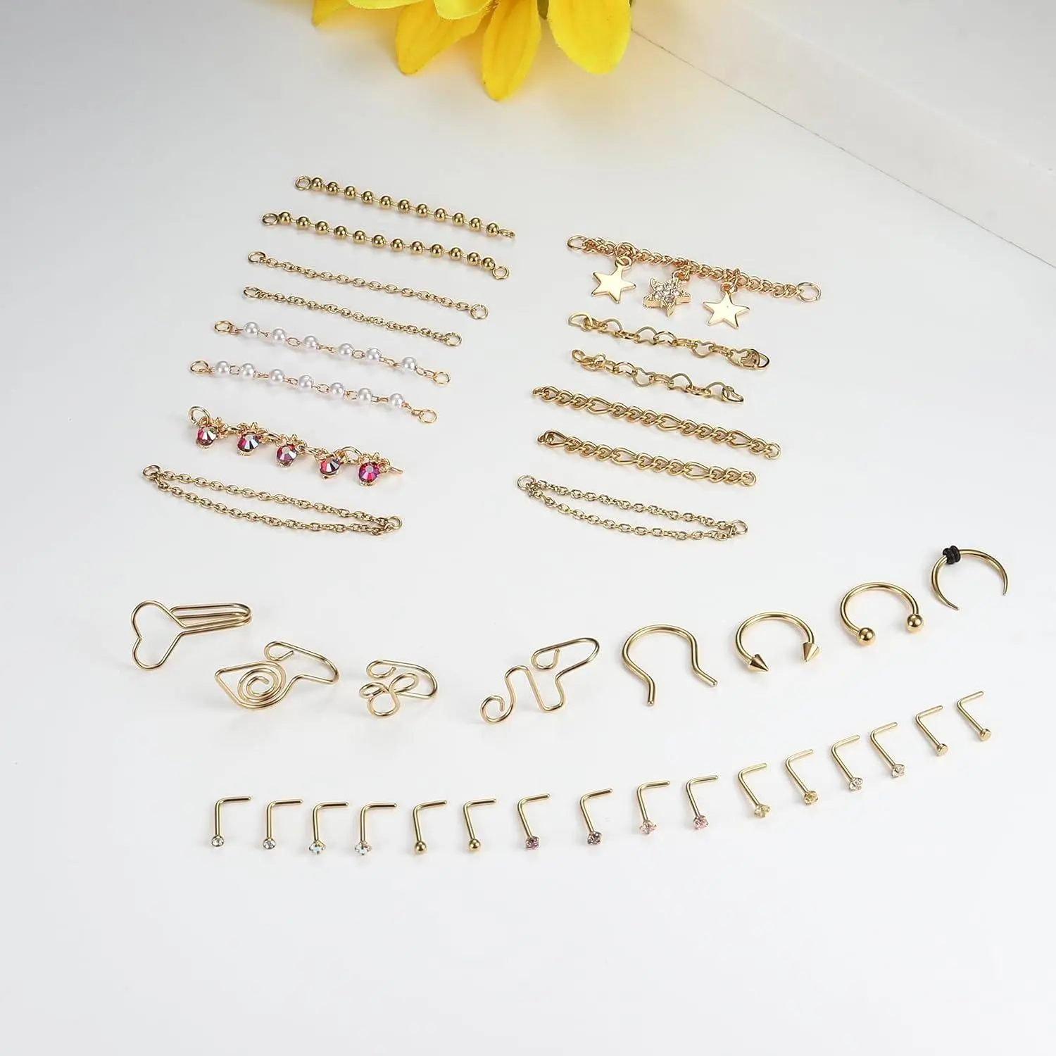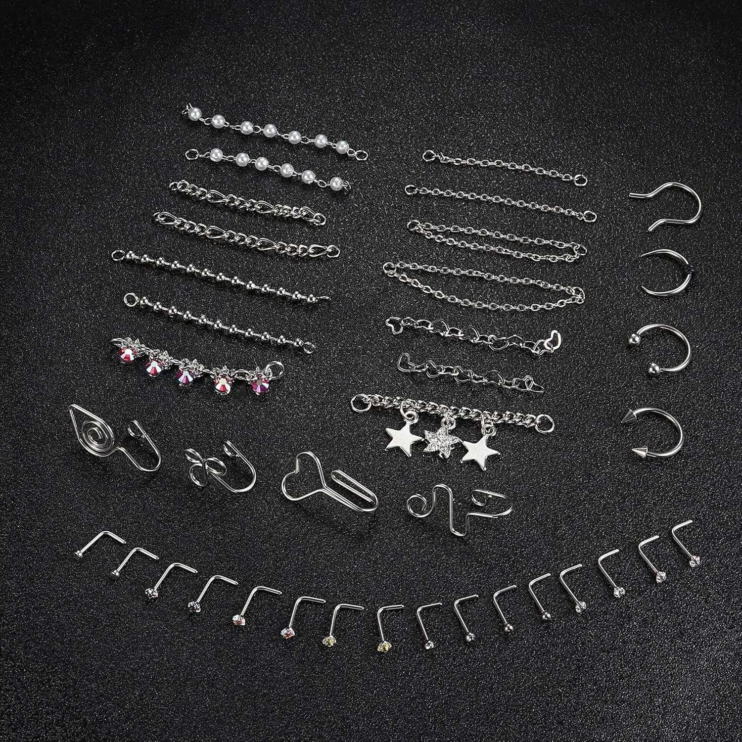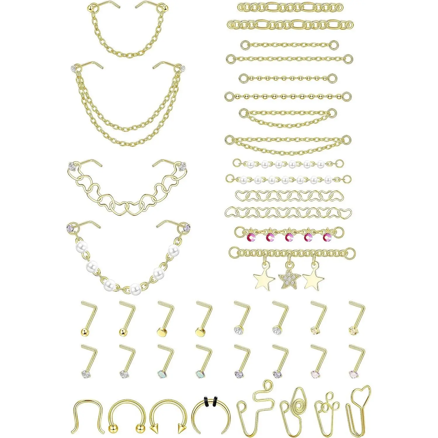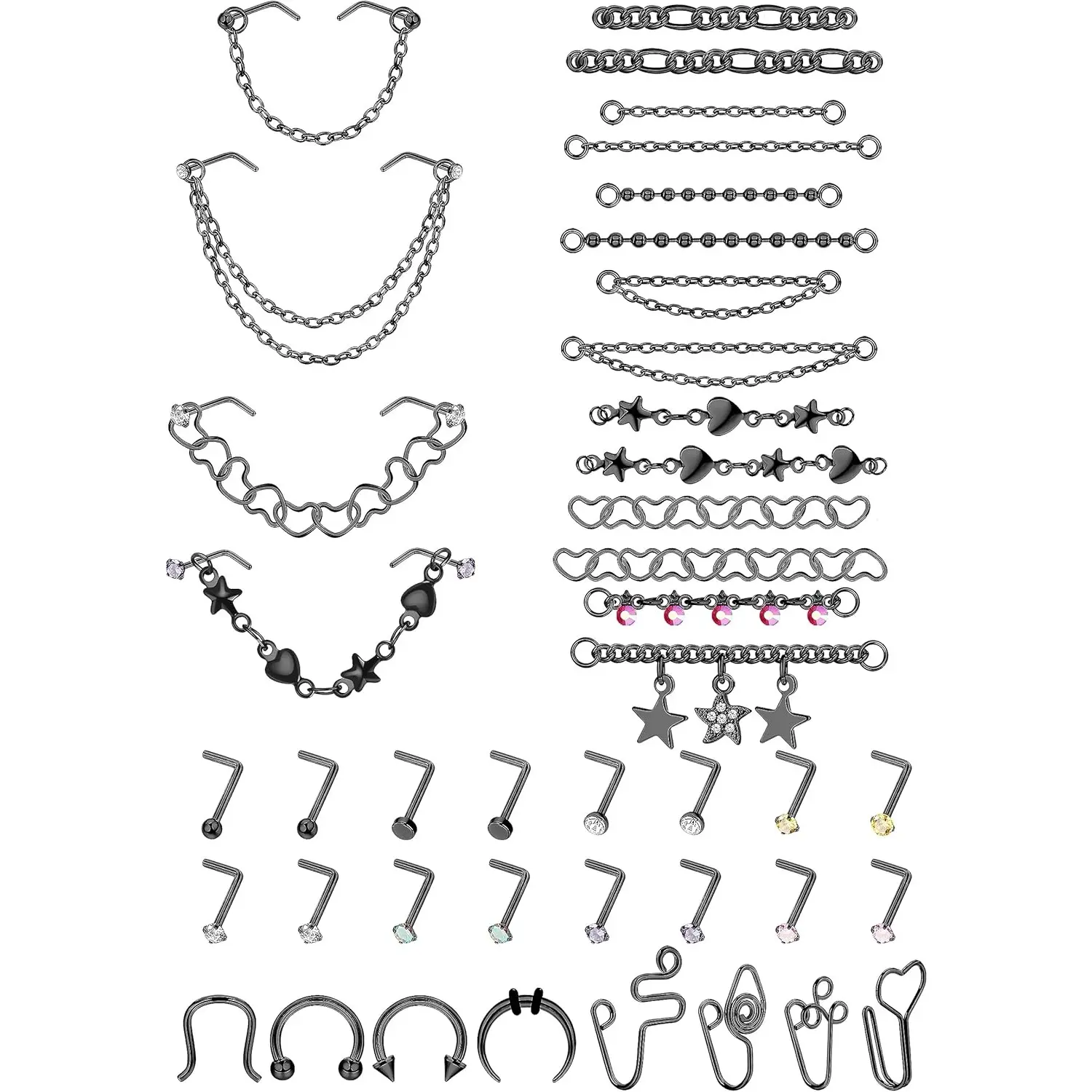 5. ZELORES 38 PCS 20G Nose Rings Studs with Chains African Nose Ring Cuff Horseshoe Septum Rings Stainless Steel Star Heart Nose Ring Chain Piercing Jewelry Set for Women Men