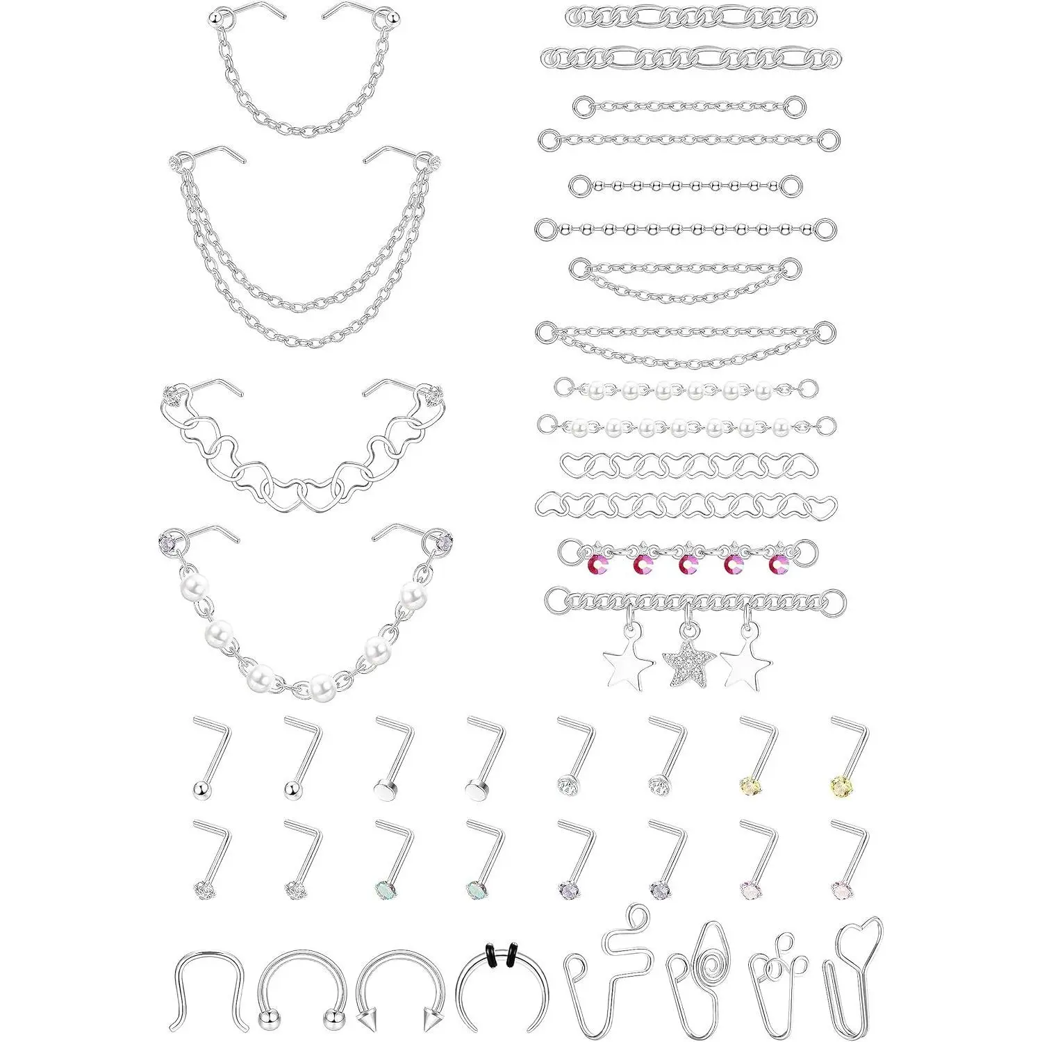 ZELORES  38 PCS 20G Nose Rings Studs with Chains African Nose Ring Cuff Horseshoe Septum Rings Stainless Steel Star Heart Nose Ring Chain Piercing Jewelry Set for Women MenZELORES  38 PCS 20G Nose Rings Studs with Chains African Nose Ring Cuff Horseshoe Septum Rings Stainless Steel Star Heart Nose Ring Chain Piercing Jewelry Set for Women Men