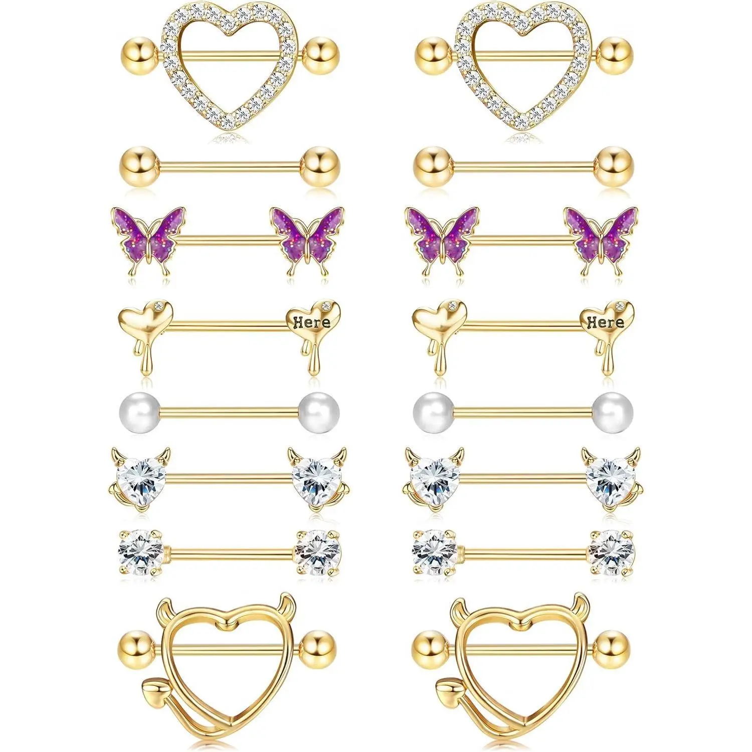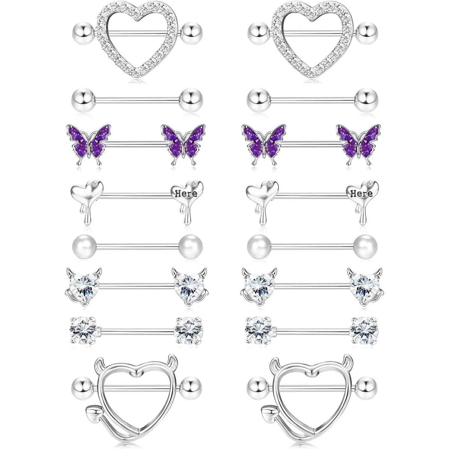 5. ZELORES 8 Pairs 14G Nipple Rings for Women Stainless Steel CZ Striaght Barbell Tongue Ring Nipple ring Set Butterfly Devil Heart Nipple Piercing Jewelry 16mm 5/8Inch
