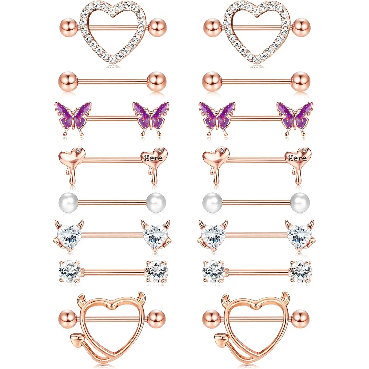 ZELORES  8 Pairs 14G Nipple Rings for Women Stainless Steel CZ Striaght Barbell Tongue Ring Nipple ring Set Butterfly Devil Heart Nipple Piercing Jewelry 16mm 5/8InchZELORES  8 Pairs 14G Nipple Rings for Women Stainless Steel CZ Striaght Barbell Tongue Ring Nipple ring Set Butterfly Devil Heart Nipple Piercing Jewelry 16mm 5/8Inch
