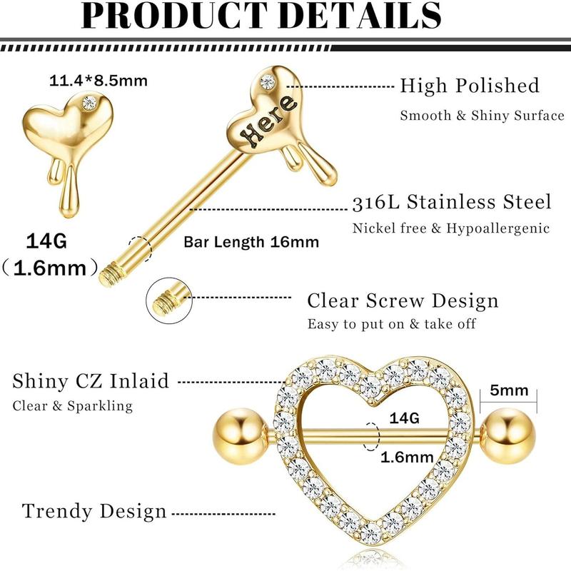 ZELORES  8 Pairs 14G Nipple Rings for Women Stainless Steel CZ Striaght Barbell Tongue Ring Nipple ring Set Butterfly Devil Heart Nipple Piercing Jewelry 16mm 5/8Inch