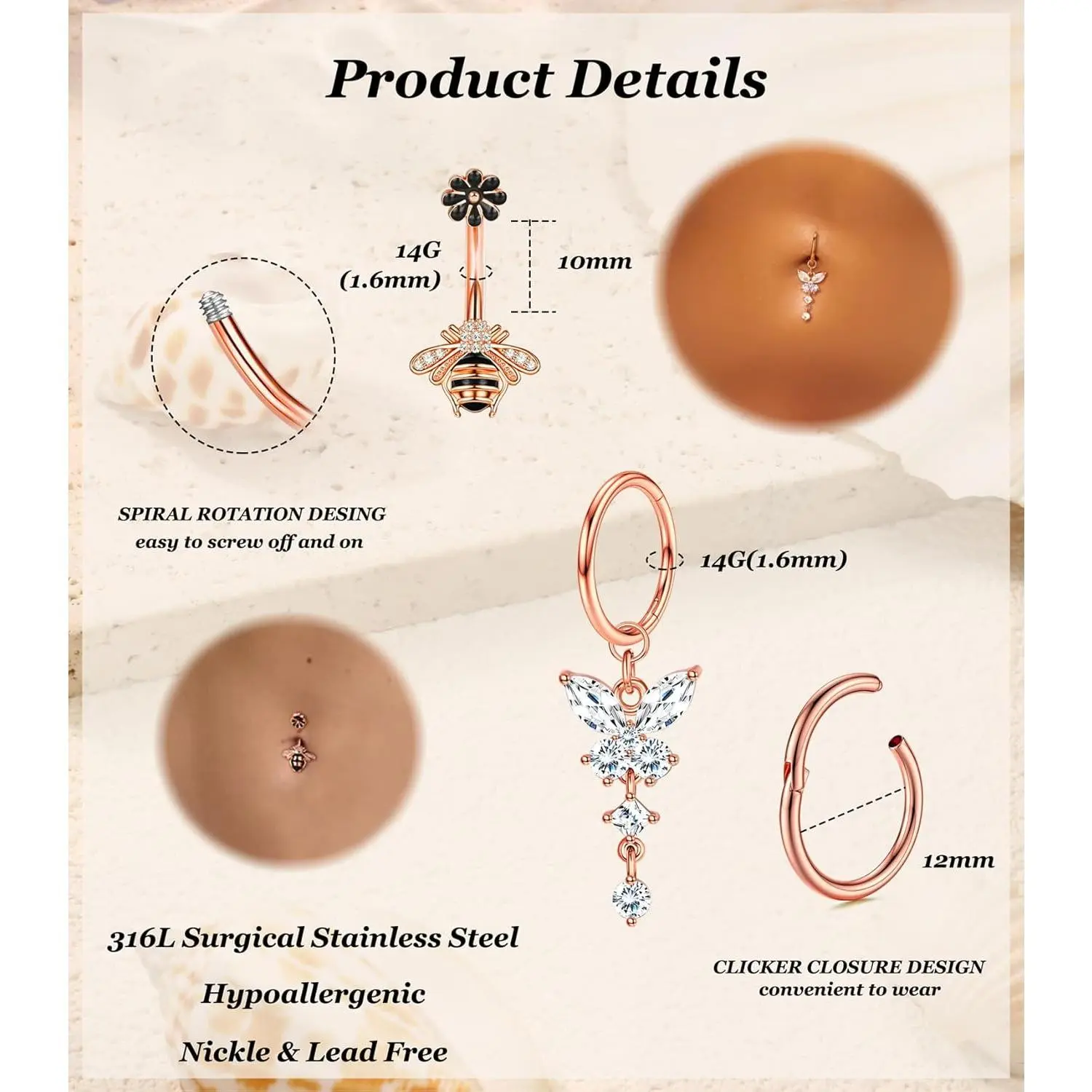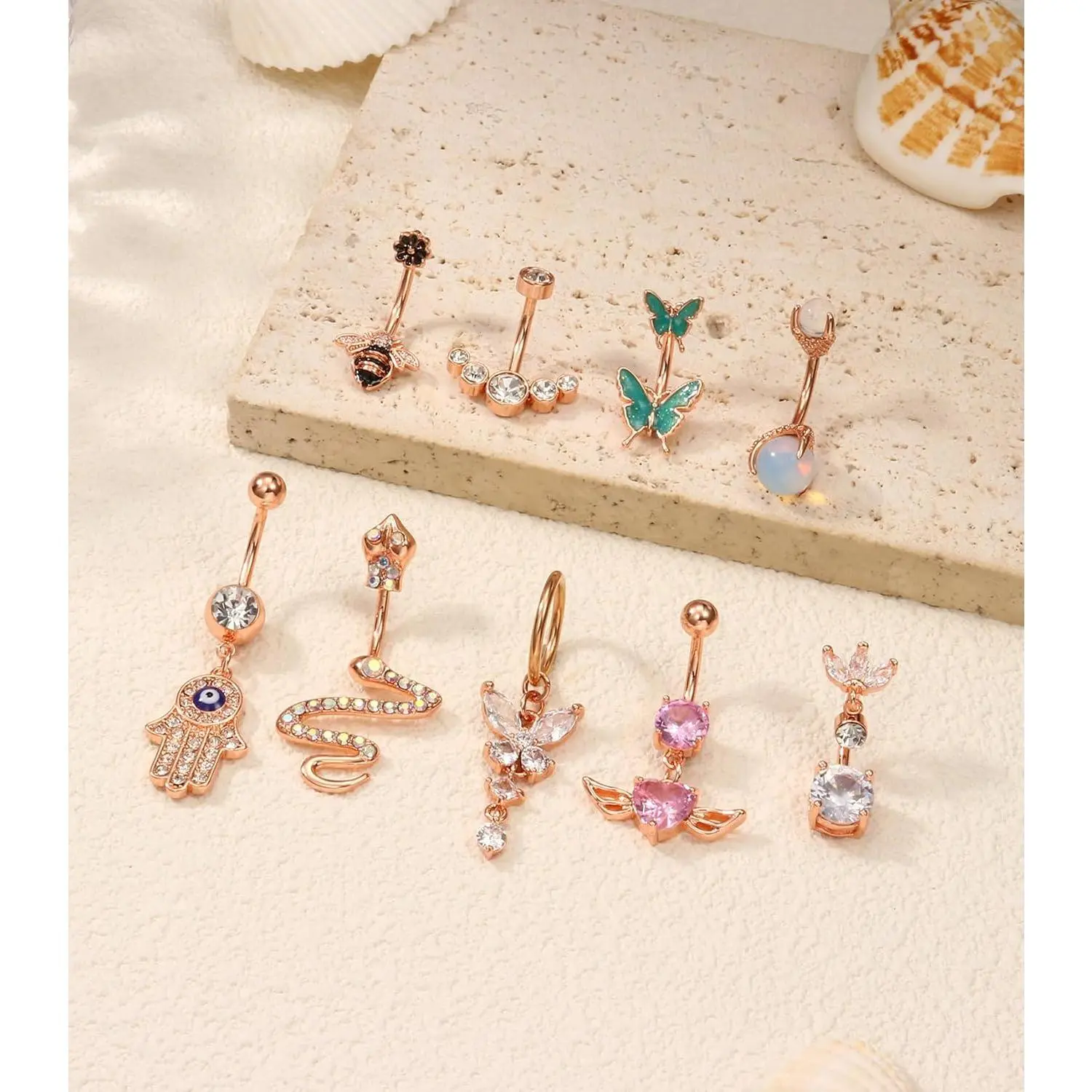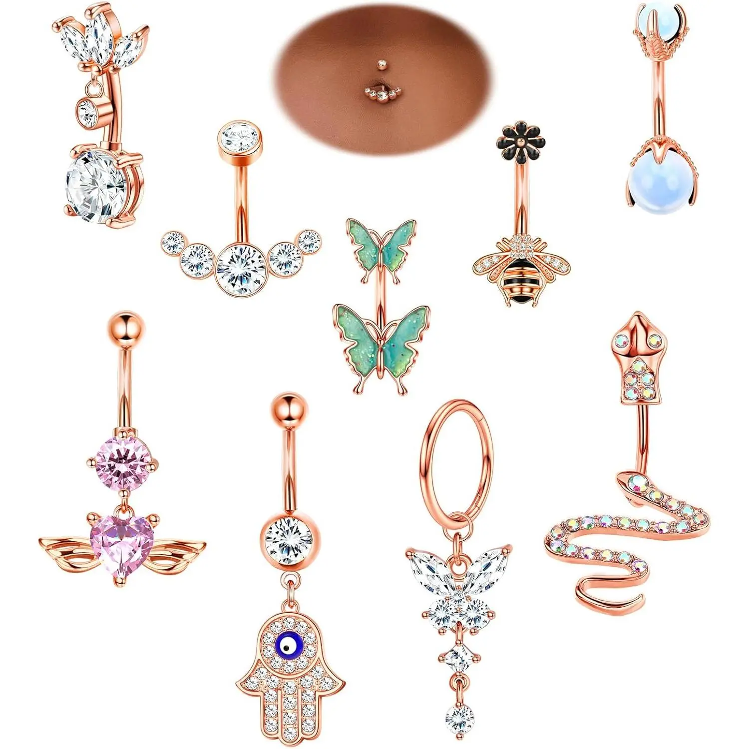 5. ZELORES 9Pcs 14G Belly Button Rings for Women Surgical Stainless Steel Belly Rings Cute Navel Rings Butterfly Snake Evil Eye Heart Hoop Dangle Rose Gold Belly Button Piercing Jewelry Cubic Zirconia
