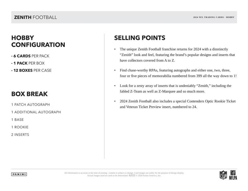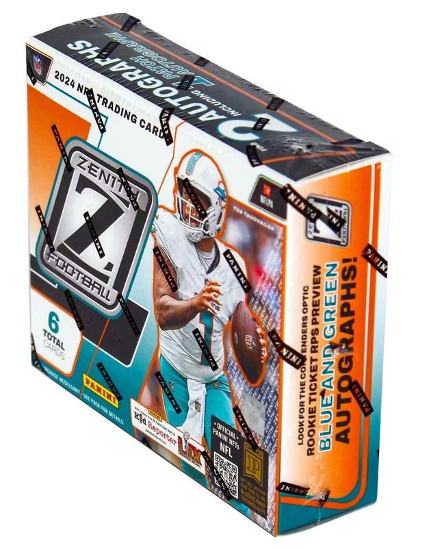 The unique Zenith Football franchise returns for 2024 with a distinctly "Zenith" look and feel, featuring the brand's popular designs and inserts that have collectors covered from A to Z.