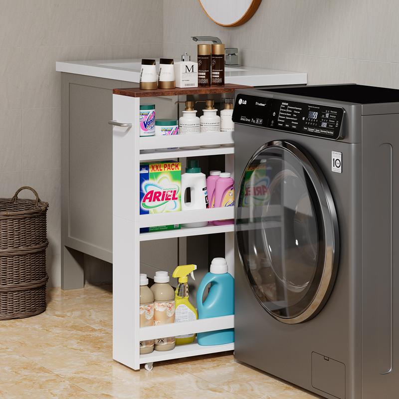 At just 5.5 inches wide, this 4-tier cart maximizes vertical storage while fitting into tight spaces such as closets, kitchens, bathrooms, living room, and laundry rooms.