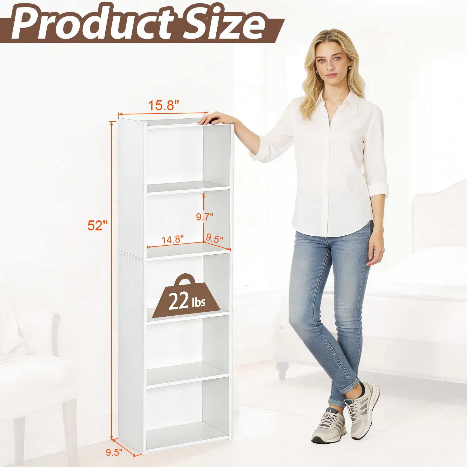 Bookcase Dimensions: Overall Dimensions: 15.8â L x 9.5â W x 52â H; Inner Shelf: 14.8â W x 8.74â D x 9.65â H; Weight Capacity: 22lbs per shelf. Please be advised that this is a compact bookshelf designed for smaller spaces. Before making your purchase, kindly review the dimensions to ensure they meet your requirements.