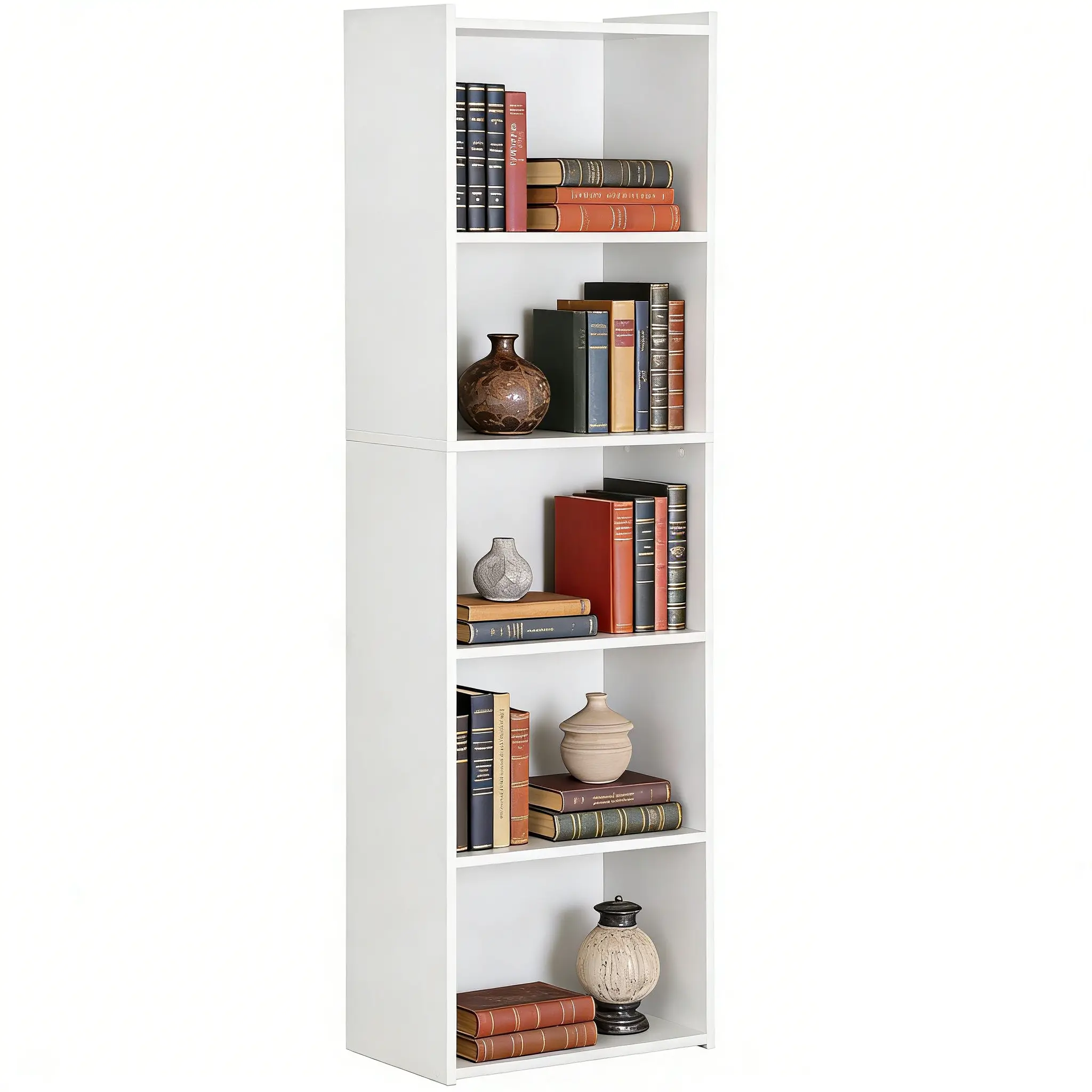 Open Shelving & Multipurpose: This bookshelf has 5 open shelves for extra storage of items like books, photos, and plants. At 9.45" wide, its slim design fits well in corners and small spaces needing more storage. It's perfect for any room, including home offices, living rooms, bedrooms, and hallways.