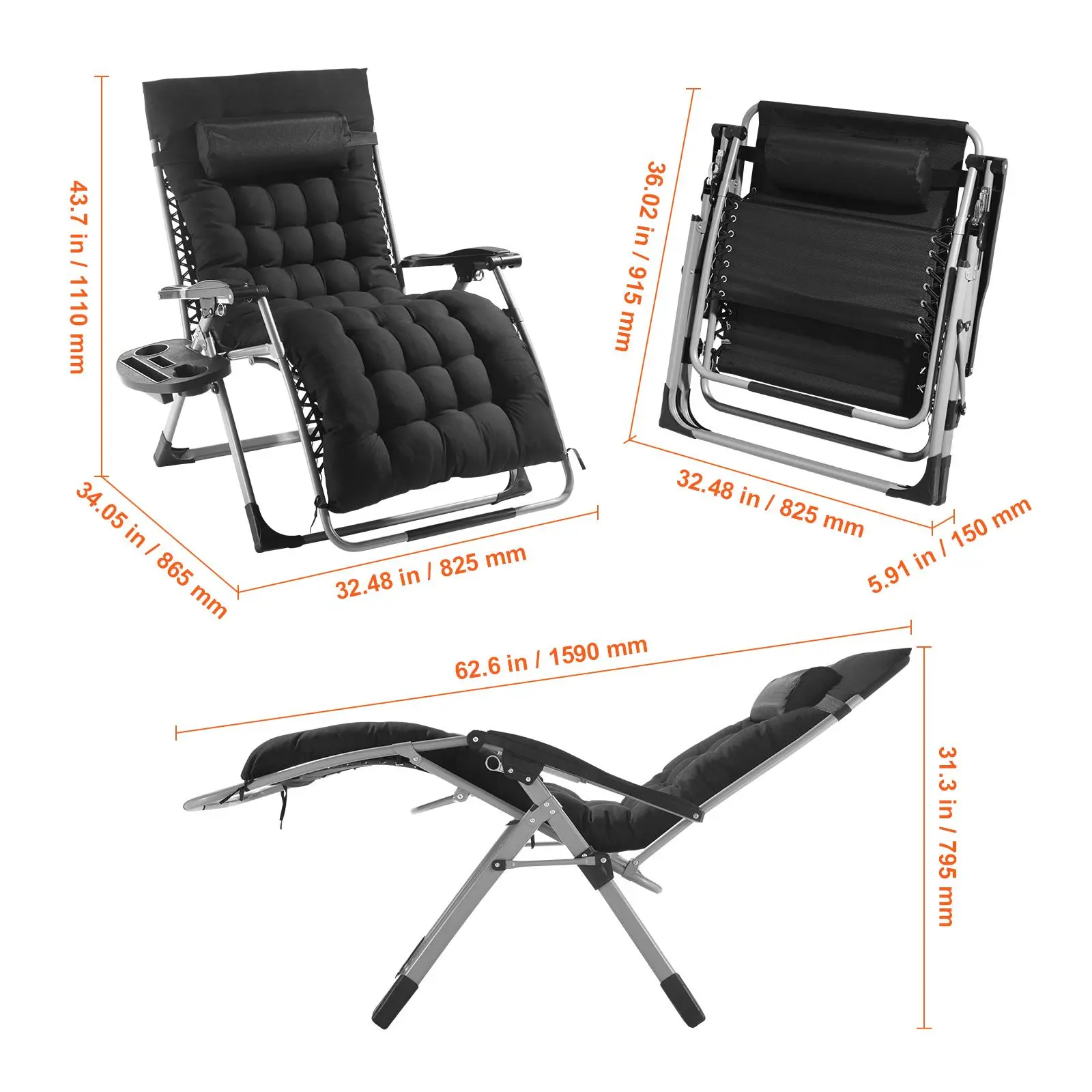 Awesome chair and very comfortable with or without the cushion”. Strong and sturdy. 33” wide is perfect with plenty of room to move around while lounging.