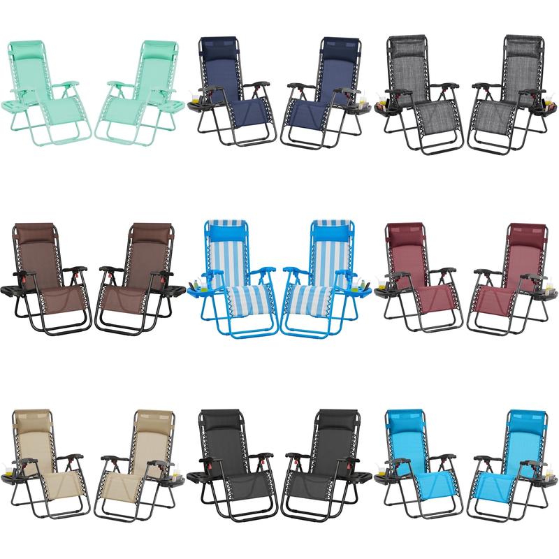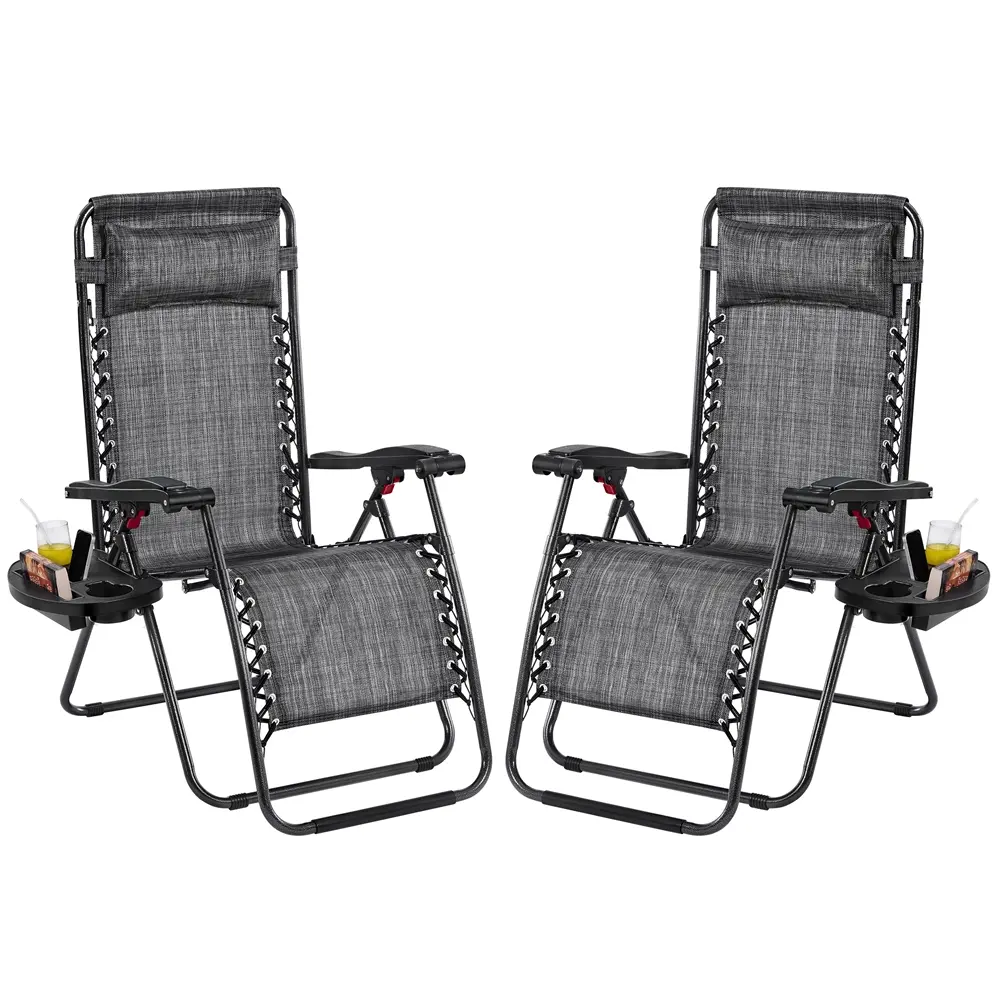 This zero-gravity outdoor recliner set is designed to provide ultimate relaxation and comfort for outdoor activities such as fishing, napping, and sunbathing. Its adaptive reclining system allows for easy adjustment and secure fixation of the backrest and footrest, while the Texteline surface, fixed with elastic straps, offers customized support for each part of your body. Made from 550g Texteline, the fabric is lightweight, durable, weather-resistant, and easy to clean, making it ideal for outdoor use. The high-hardness and lightweight painted steel support frame, designed in a triangle structure, ensures stability and safety. Additionally, this chair comes with an unfixed padded pillow and a detachable tray, providing customizable comfort and convenience. With a compact folded size and lightweight, the chair is highly portable and space-saving, while buckle and straps make it easy to carry. This 2pcs folding lounge chair set comes fully assembled, saving you time and effort.