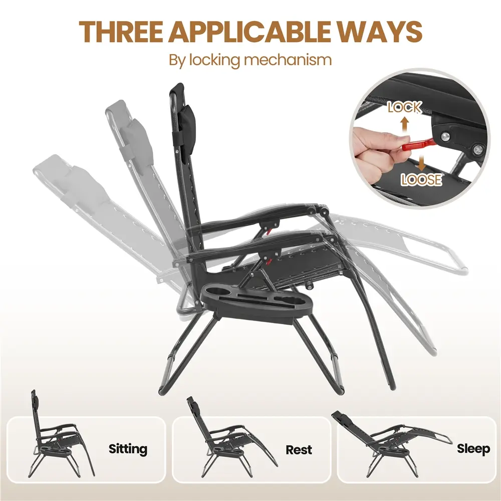 1. Adaptive Reclining System: This zero-gravity outdoor recliner aims to offer you an ultimate relaxation. The premium recliner system allows the backrest and footrest to be easily adjusted and firmly fixed at your comfortable angle. The Texteline surface, fixed on the metal frame with elastic straps, adapts to your figure and provides each part of your body with sufficient support