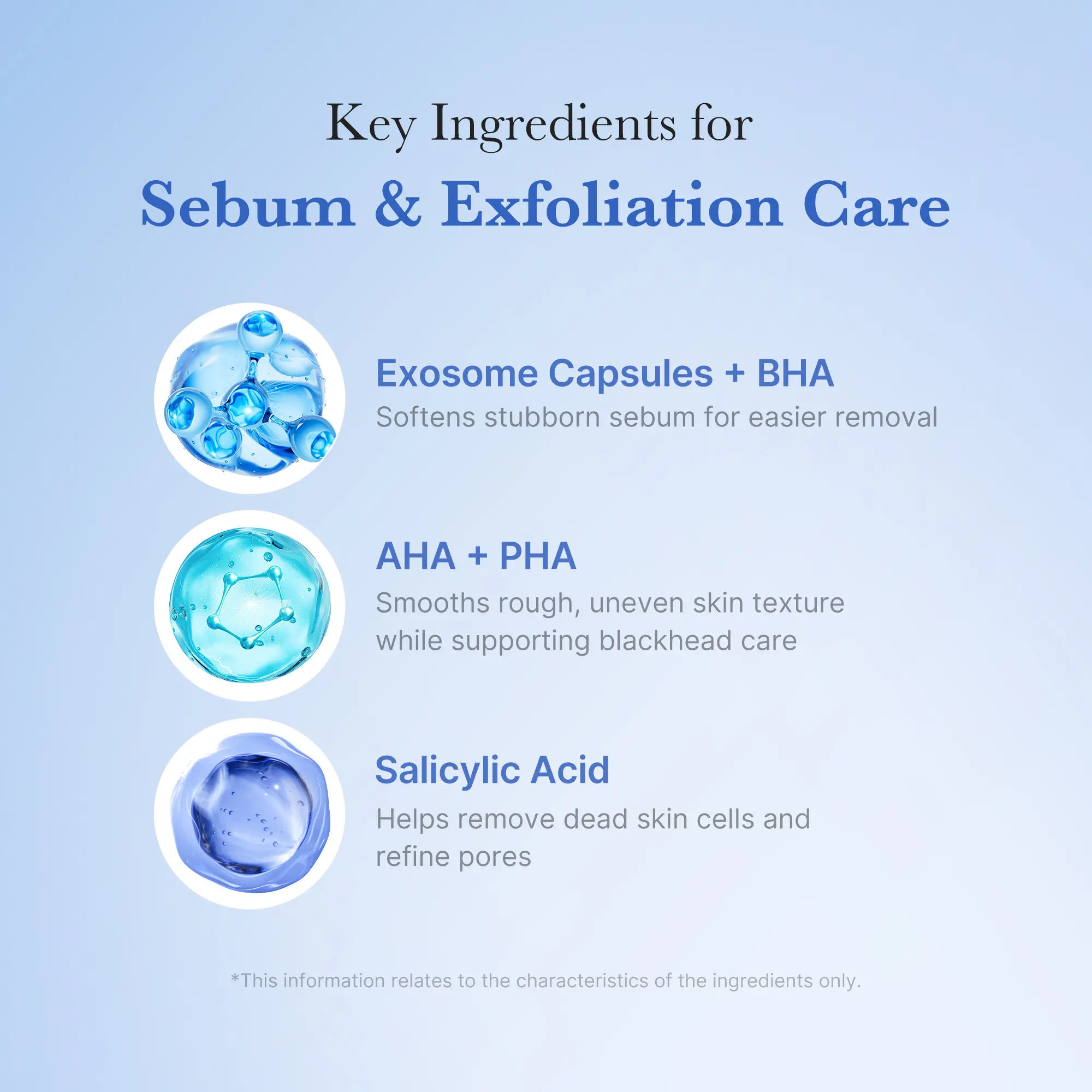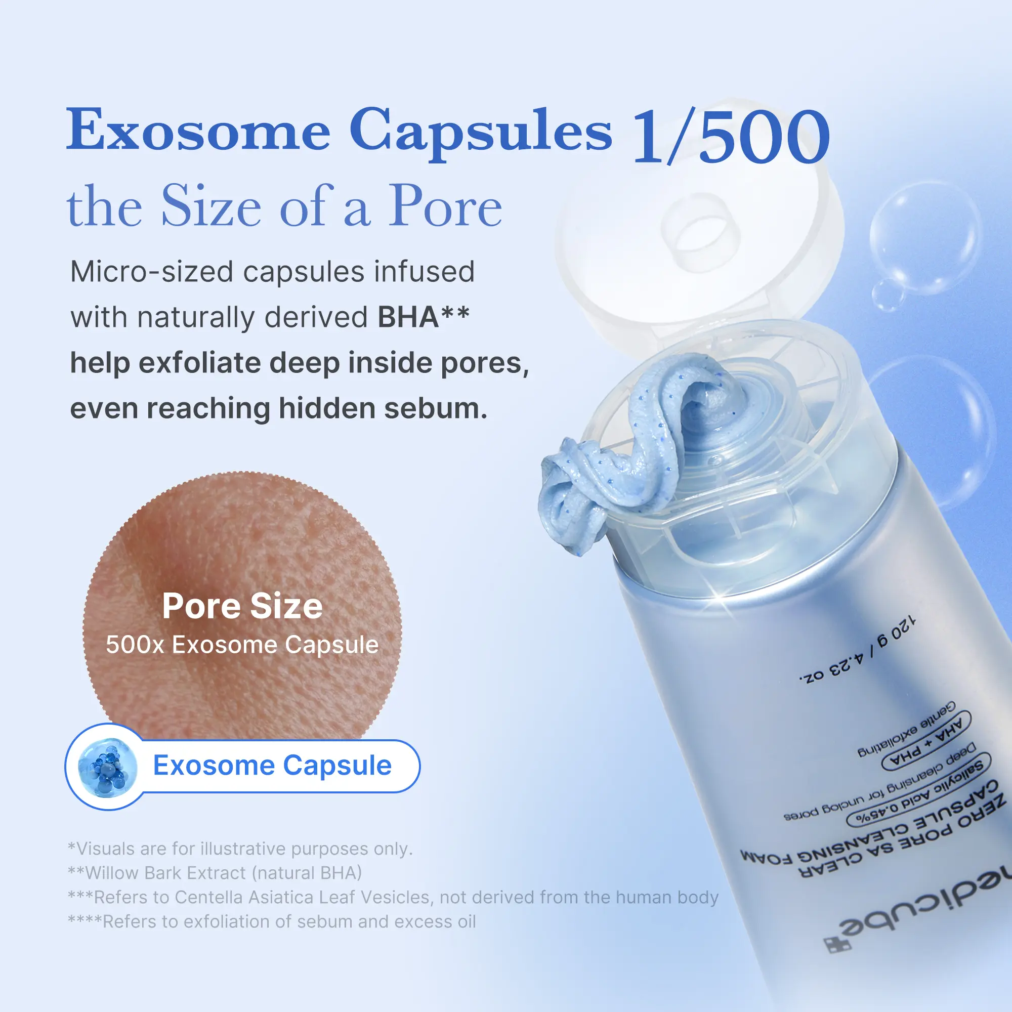 Formulated with *Cica Exosome and Natural BHA, the blue capsules help to soften excess sebum, while Silica Particles gently exfoliate dead skin cells and impurities, leaving the skin feeling refreshed and clear