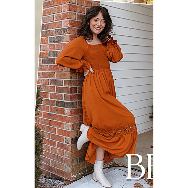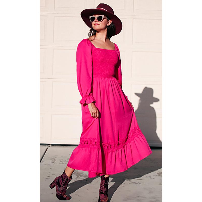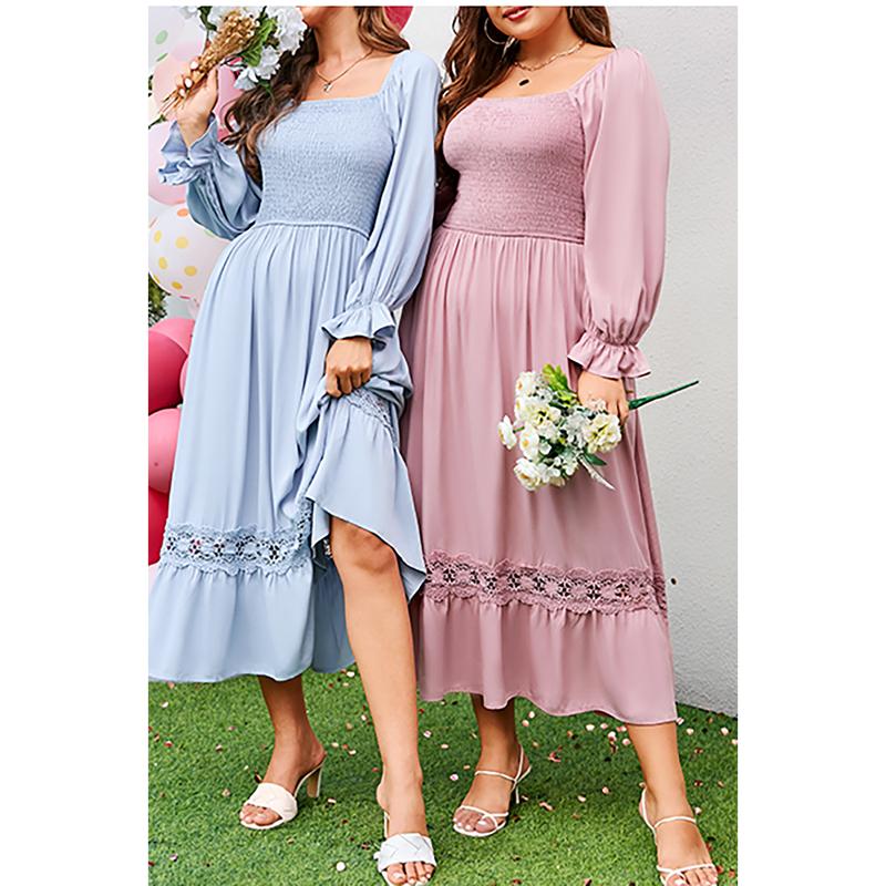·Flattering sweet dress features long flounce sleeves, square neck with backless design, with elastic band at shoulder/cuffs, popular smocked bodice, with flowy lace trim long skirt.