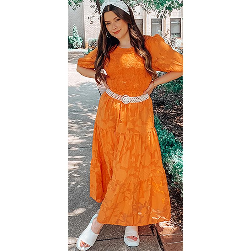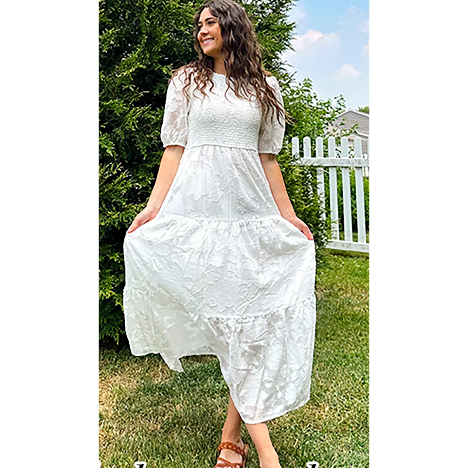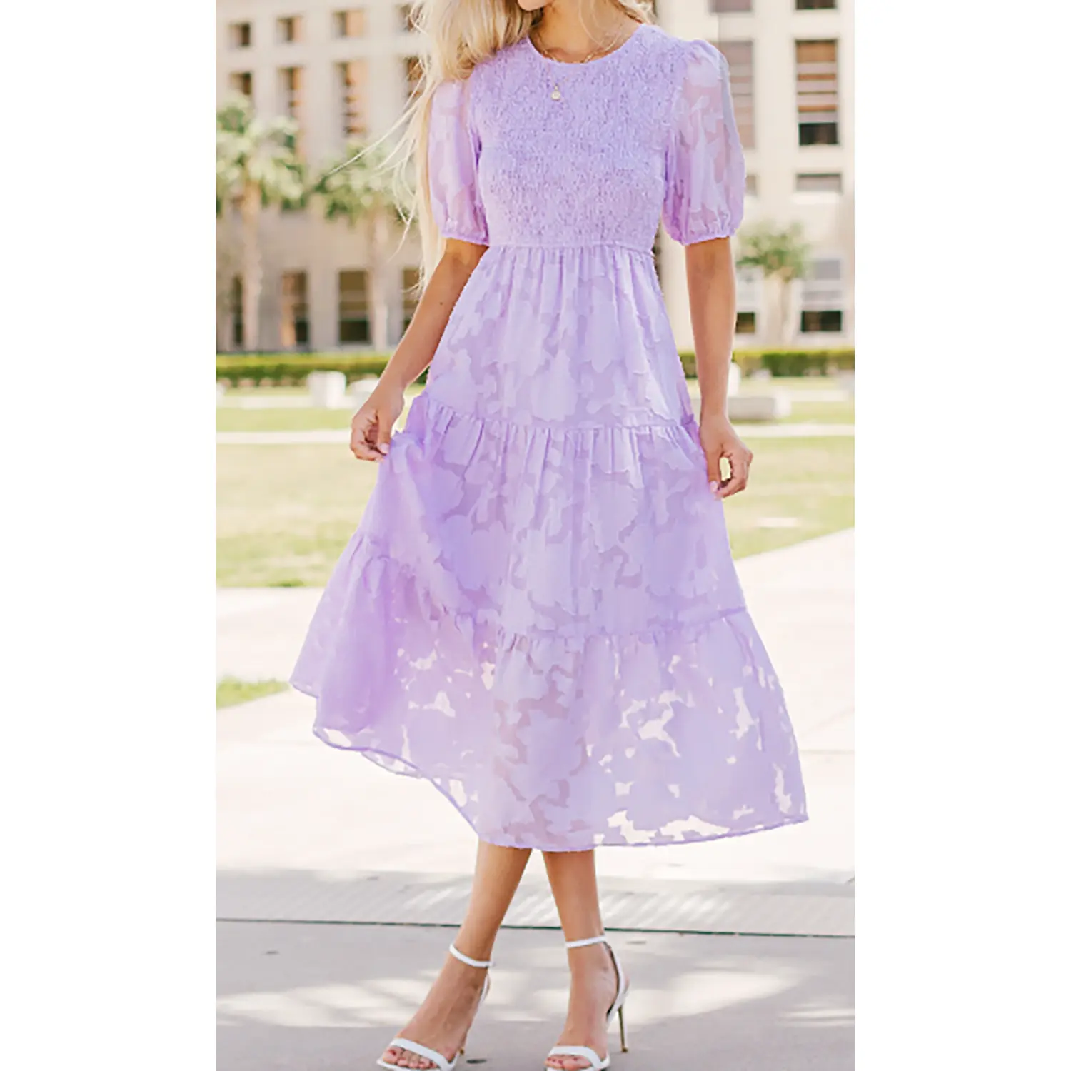 ·Dance in the stunning Smocked Maxi Dress this summer. This elegant dress features a gorgeous floral lace print, round neckline, sheer bubble sleeve and elastic cuff, stretchy bodice and a flowy tiered midi skirt, back button keyhole closure, high waist, swing, a line, solid color.