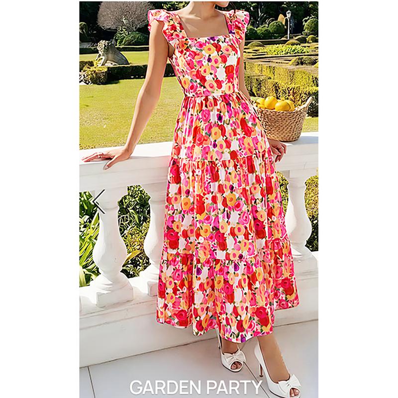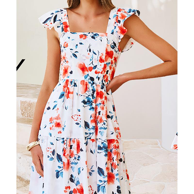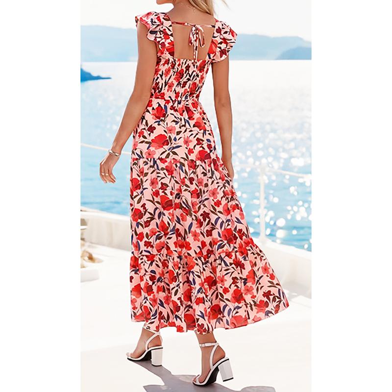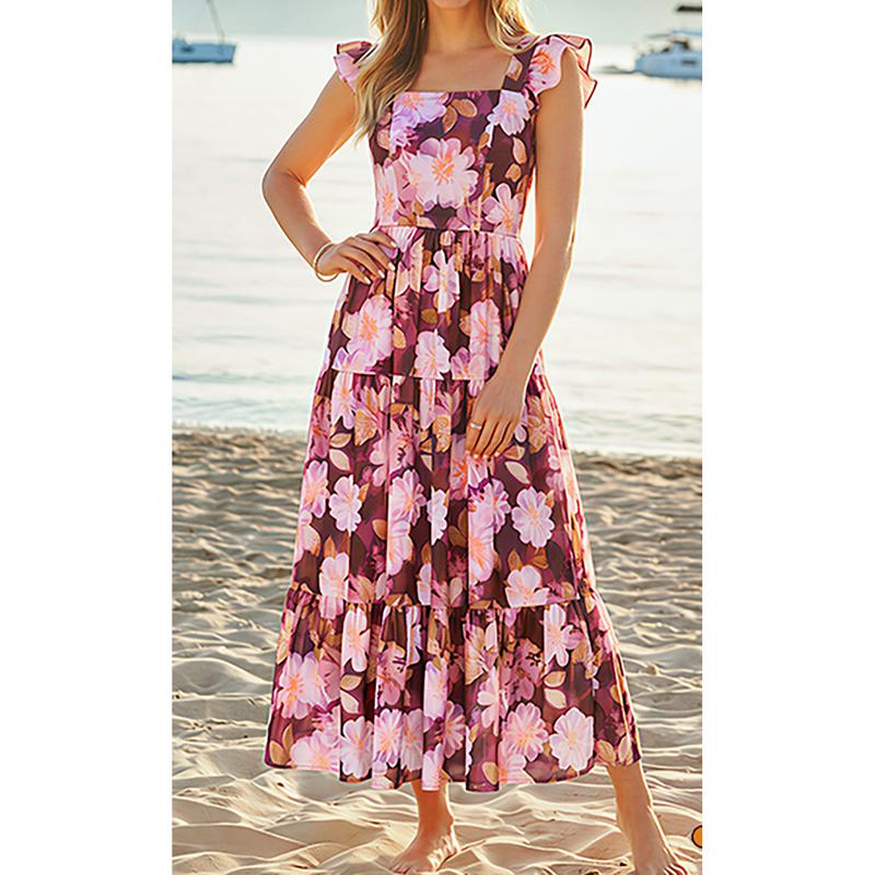 ·Features: Ruffle cap sleeve, square neck, high waist, a line, bohemian floral printed, midi length, features a smocked design at the back, with pockets, no zipper, flowy tiered dress. Add to your spring summer closet with this women's casual long dress