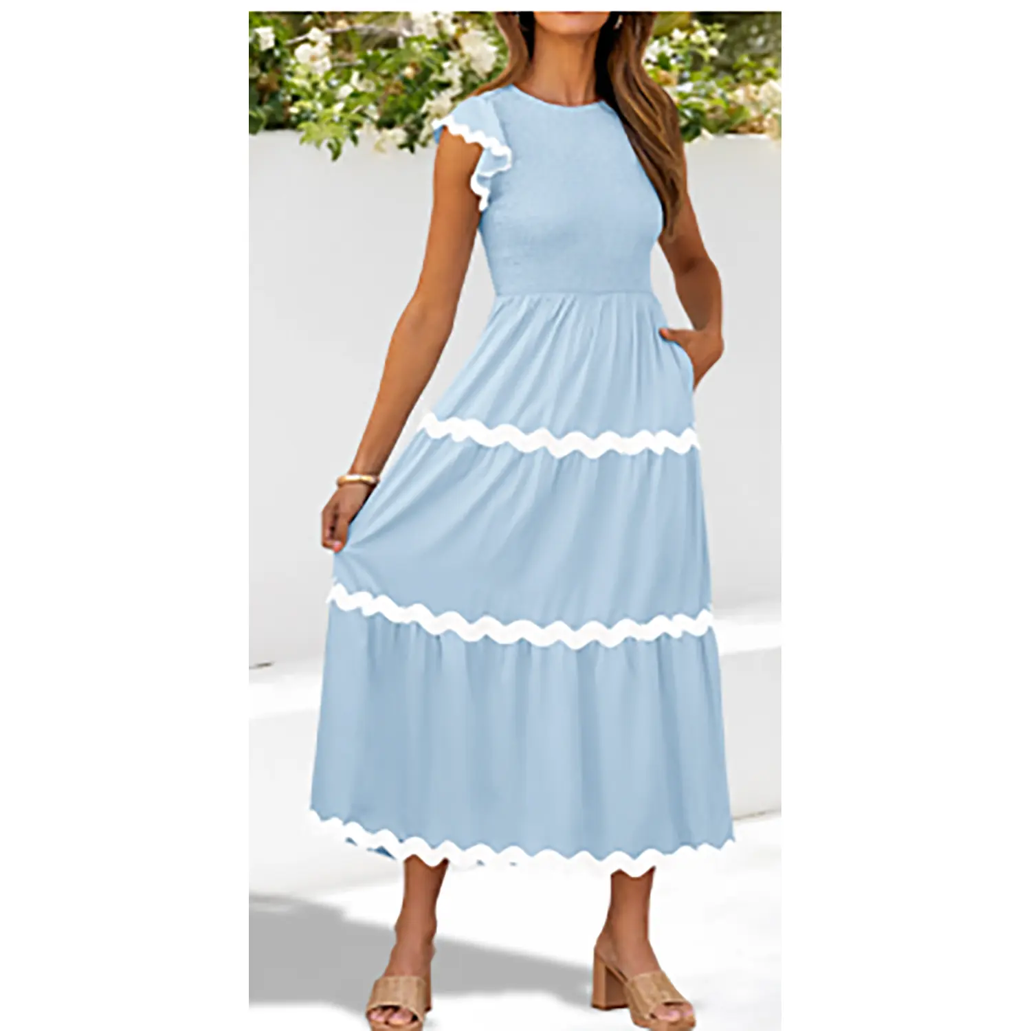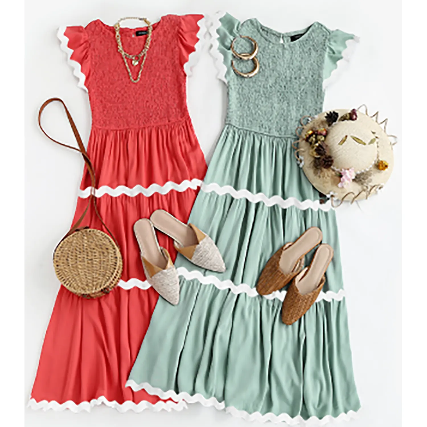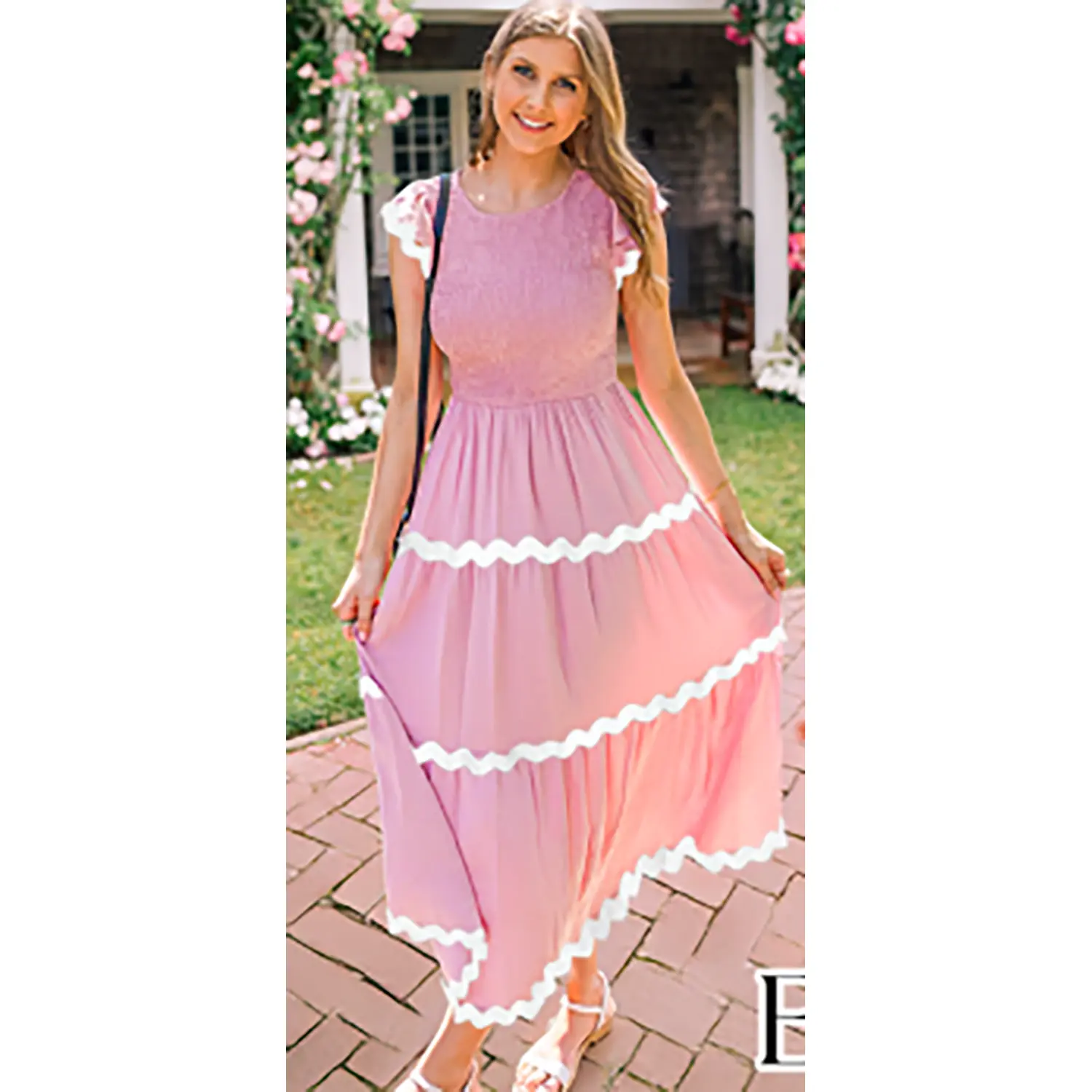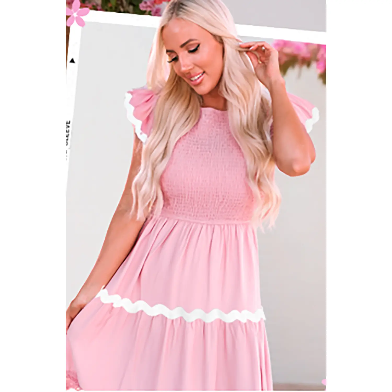 ·Our cute smocked dress features short flutter sleeves, round neck, solid color, elastic high waist, beautiful rickrack trim design, flowy a-line skirt in midi length, pull on closure, no zipper.