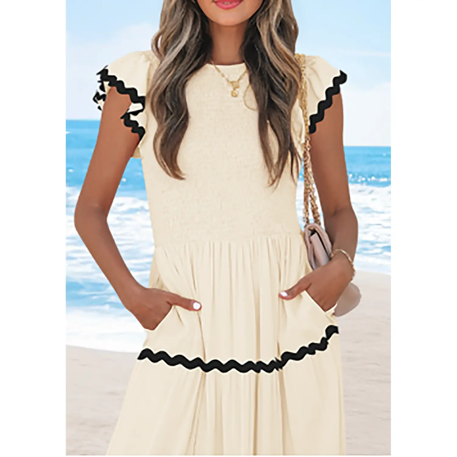 ·This elegant swing midi dress is made of soft, breathable, lightweight and stretchy fabric, smocked bodice design creates a flattering silhouette suitable for all body types, the chic wave trim adds a touch of femininity.