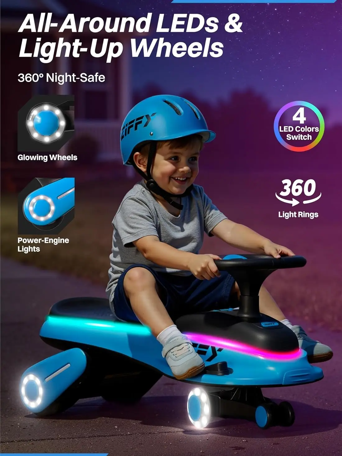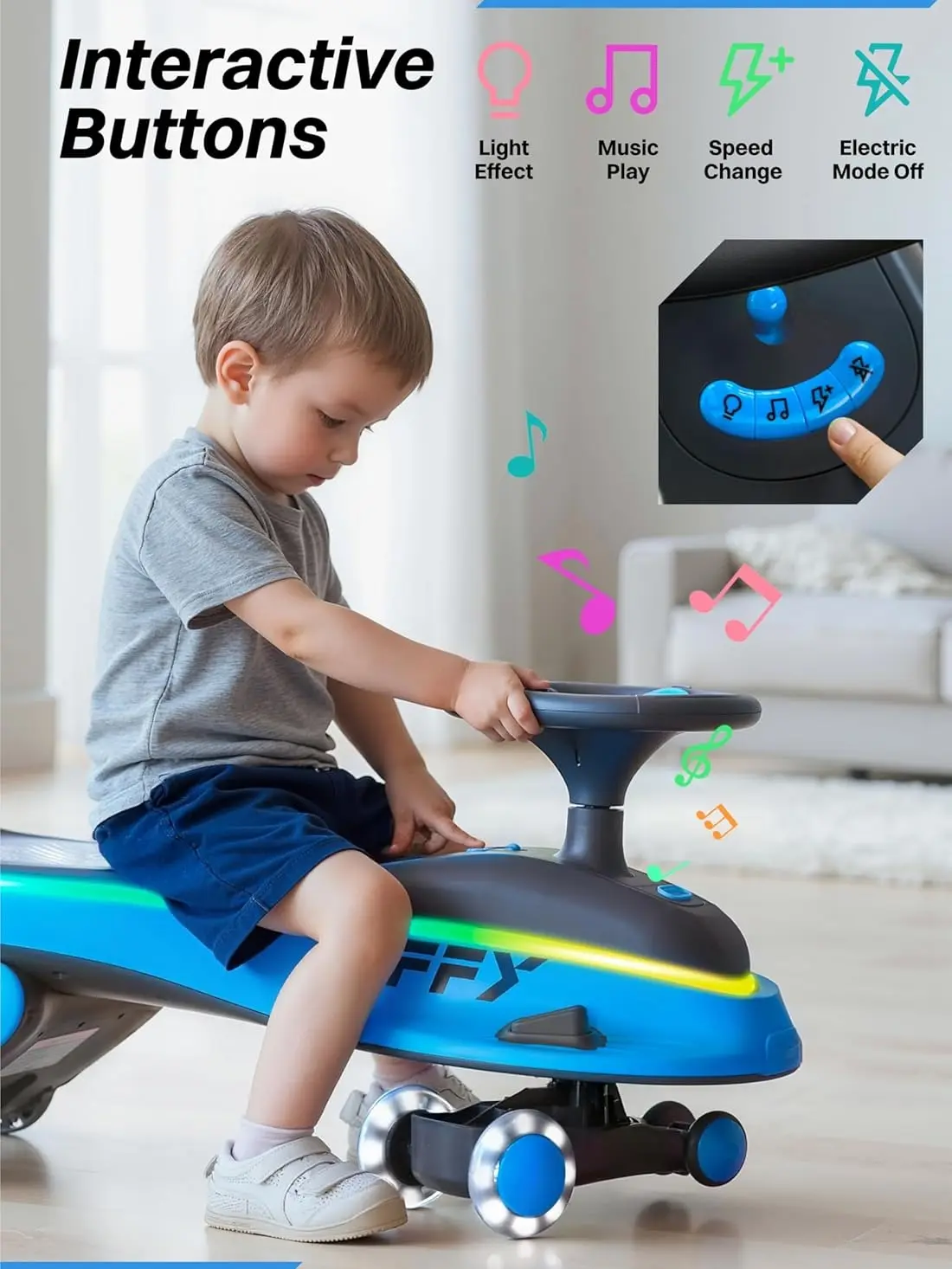 ·Ride n' Rock & Cool LED Lights Fun: Built-in HD music lets kids effortlessly enjoy their favorite tunes while riding. The wiggle car also features dynamic LED ring lights and color-flashing wheels that deliver a dazzling, carnival-like experience, turning every journey into a party!