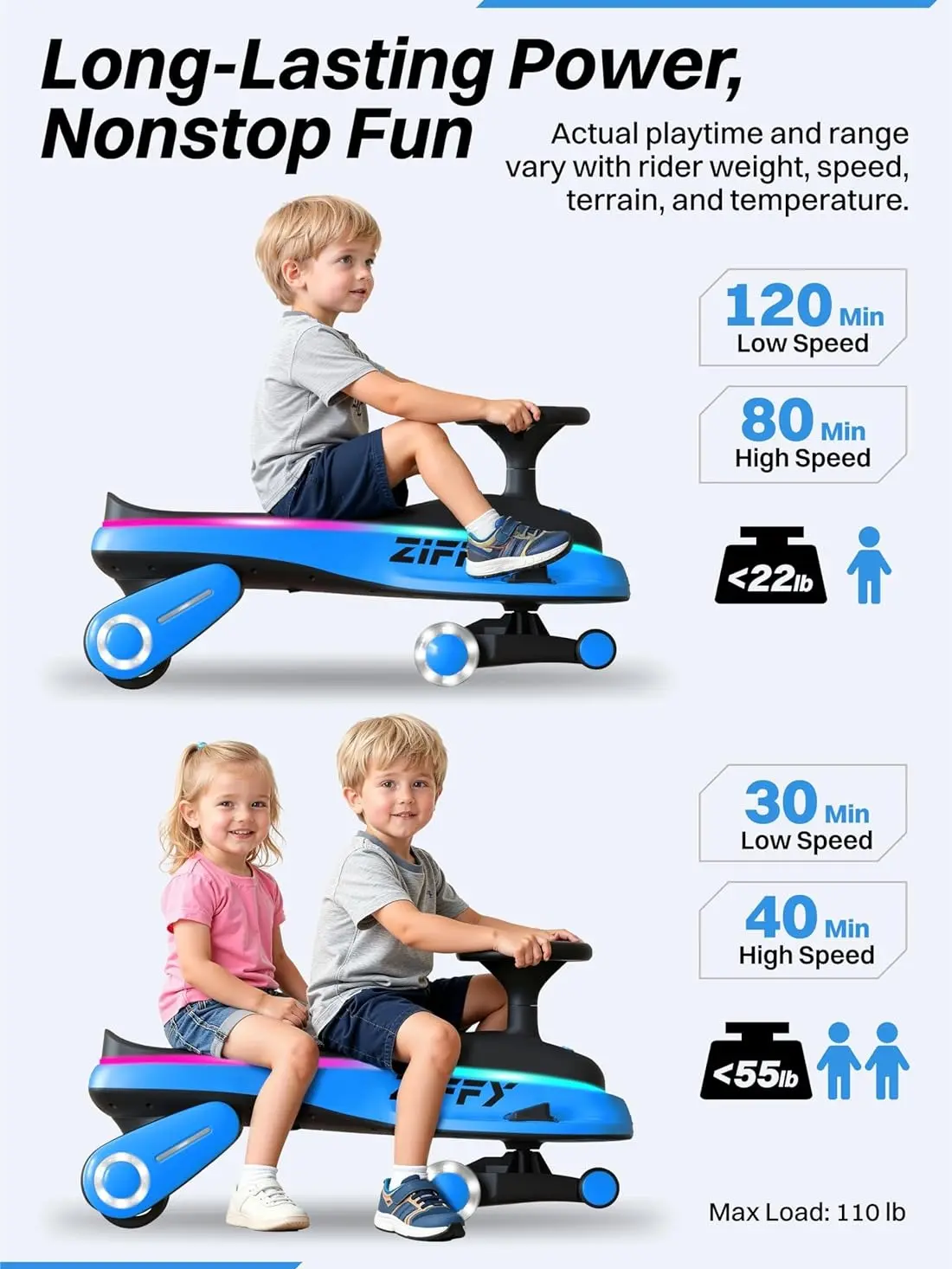 ·Long-Lasting Battery & Multi-Function Controls: The electric wiggle car enjoys extended riding fun with up to 120 minutes on low speed and 80 minutes on high speed. Convenient multi-function buttons provide effortless control of speed modes, music, and lighting, making every ride simple and fun!