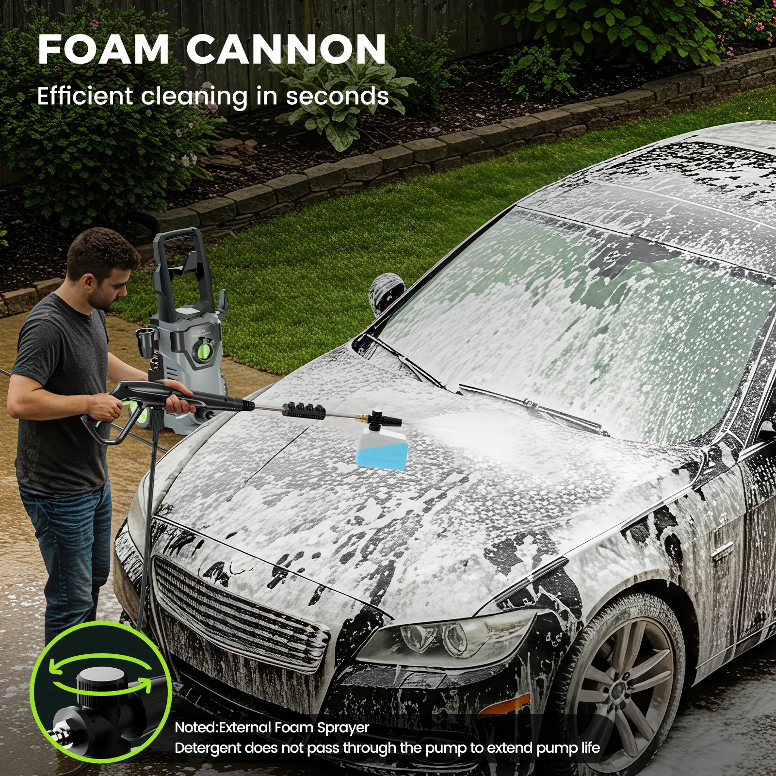 Car Wash Convenience - 4 Brass Nozzles: Allows for easy adjustment of pressure. - External Foam Cannon: Produces dense foam quickly for effective car washing.