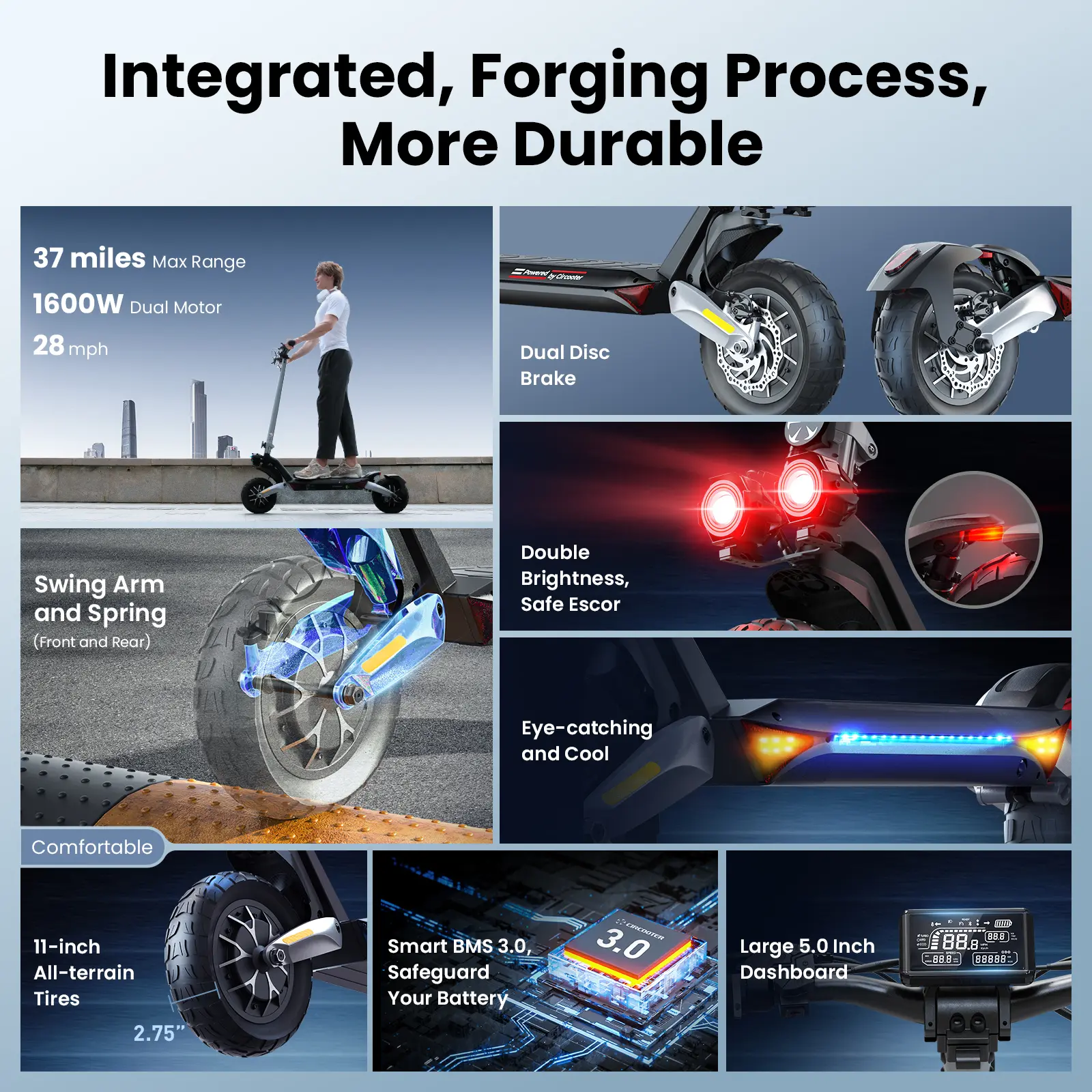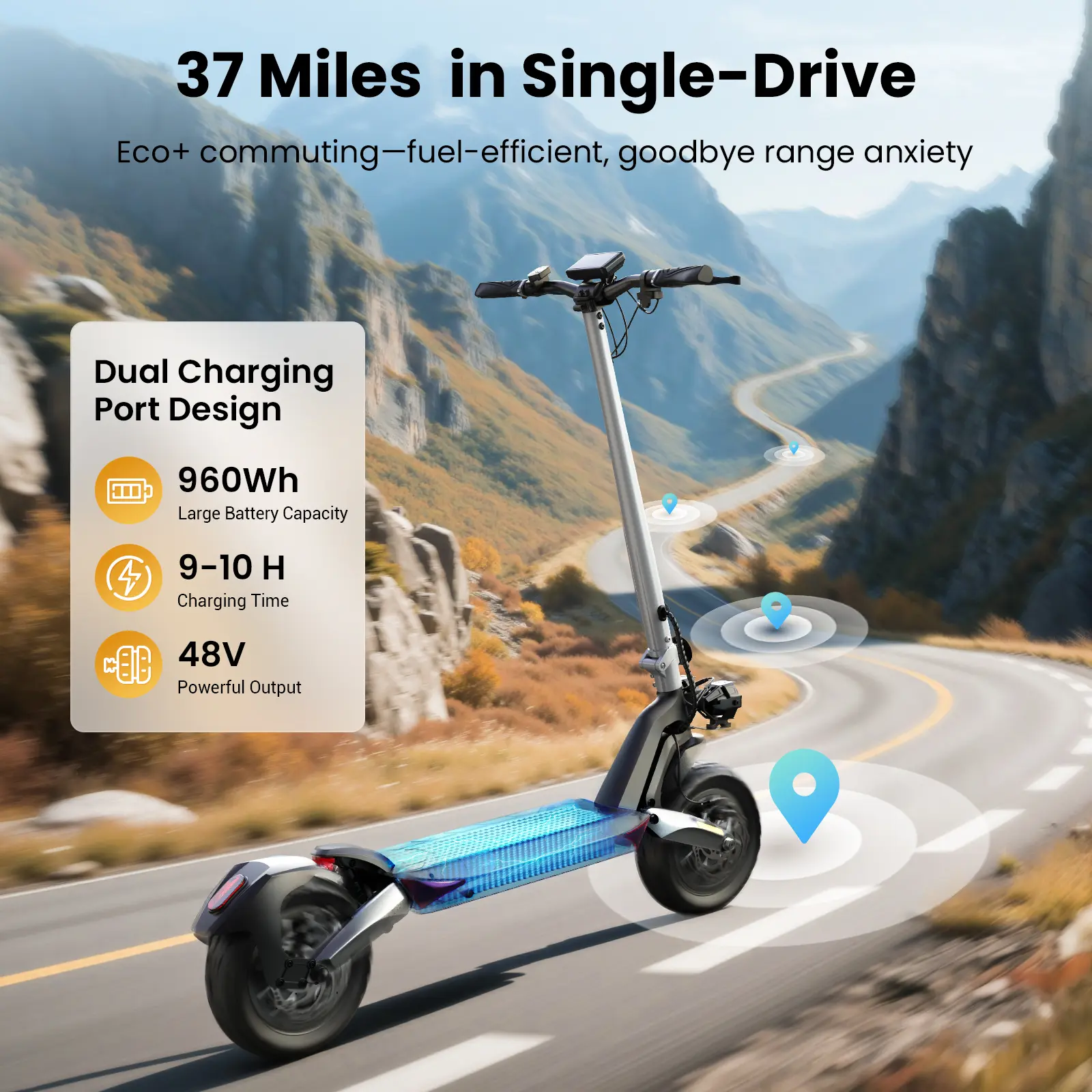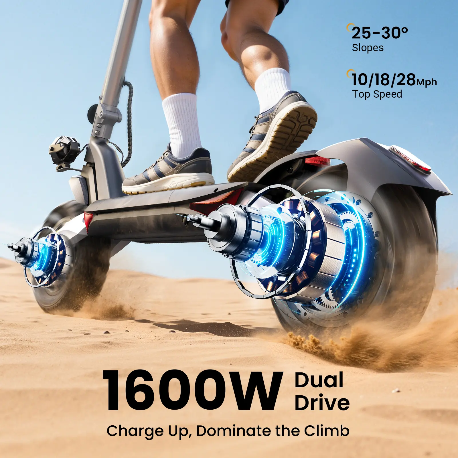 Equipped with a 1600W dual-drive motor, the R1 PRO electric scooter offers strong power and fast acceleration. It delivers smooth hill climbing and impressive top speeds, perfect for city streets and rough roads. Enjoy a thrilling yet stable riding experience.
