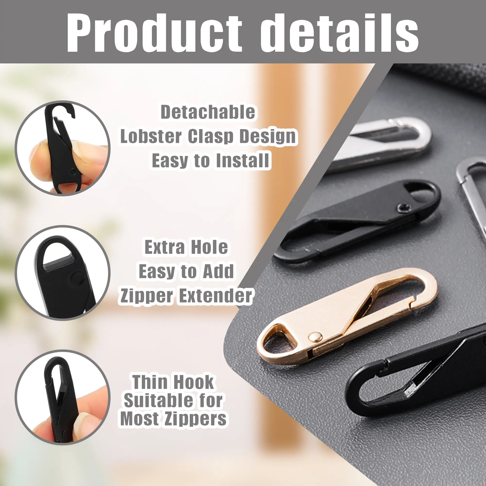 The zipper clipped onto my sweater and works great! It came in different finishes too. I recommend!!!
