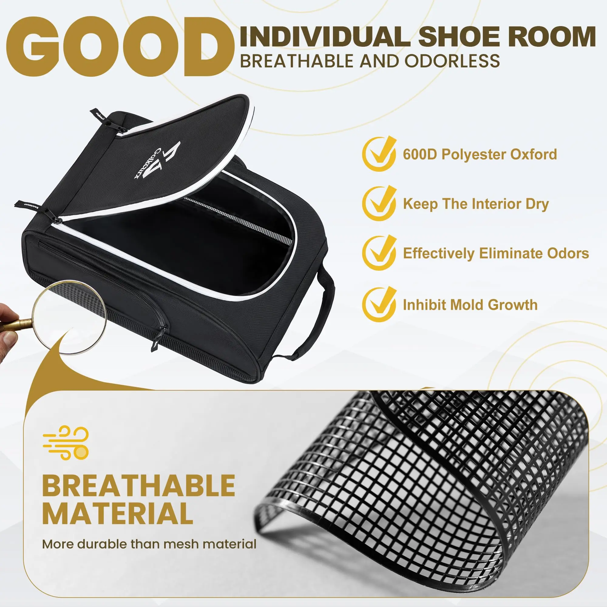 【Ventilation Design】Golf shoe carrier bag built with side ventilation to air out the contents, giving your shoe room to breathe and the smell to dissipate. Keep this stored in your golf trunk for a day on the course
