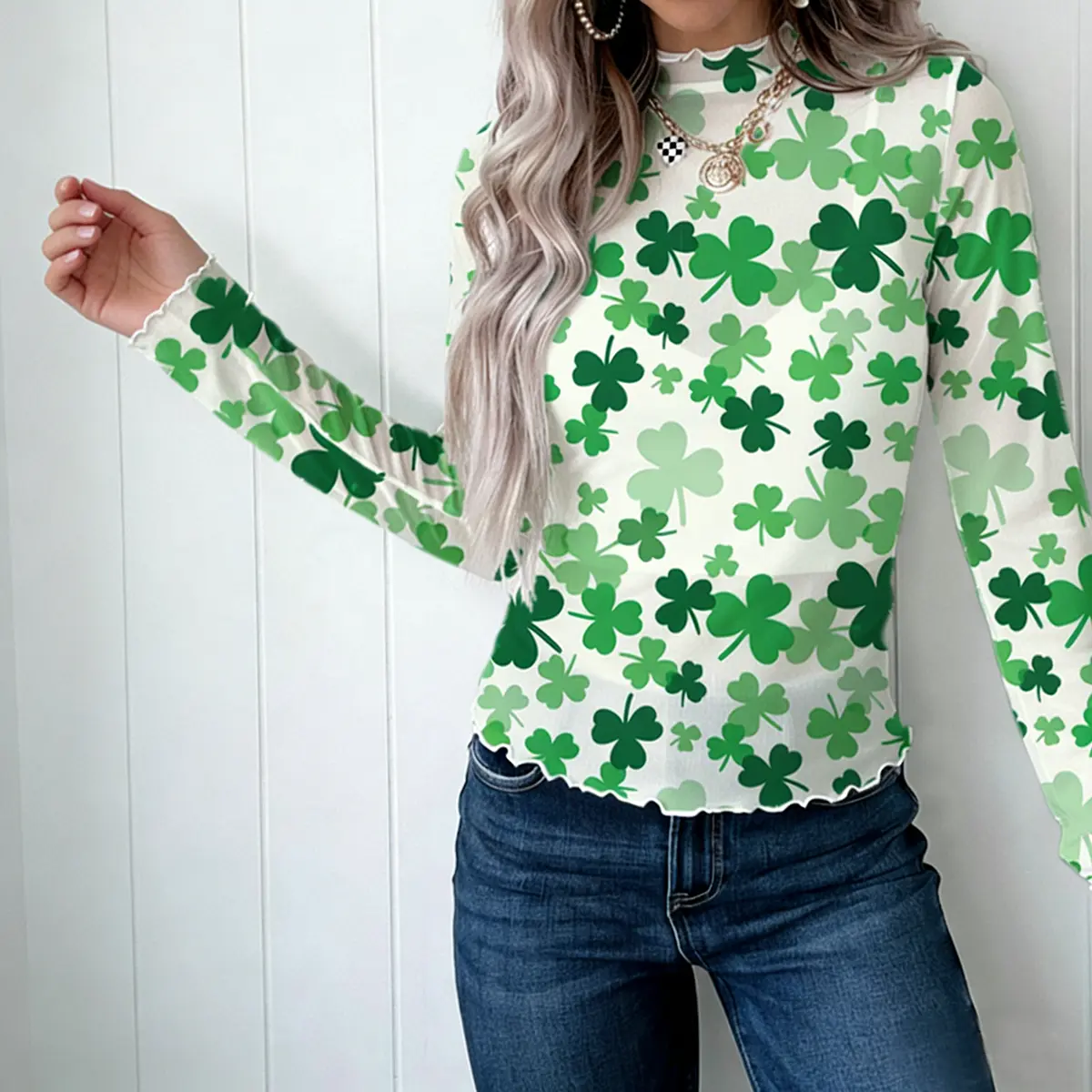 Znacicc Women's St. Patrick's Day Sheer Mesh Top with Green Clover Pattern Romantic Lettuce Edge Trim on High Neck and Sleeves Chic Everyday Look