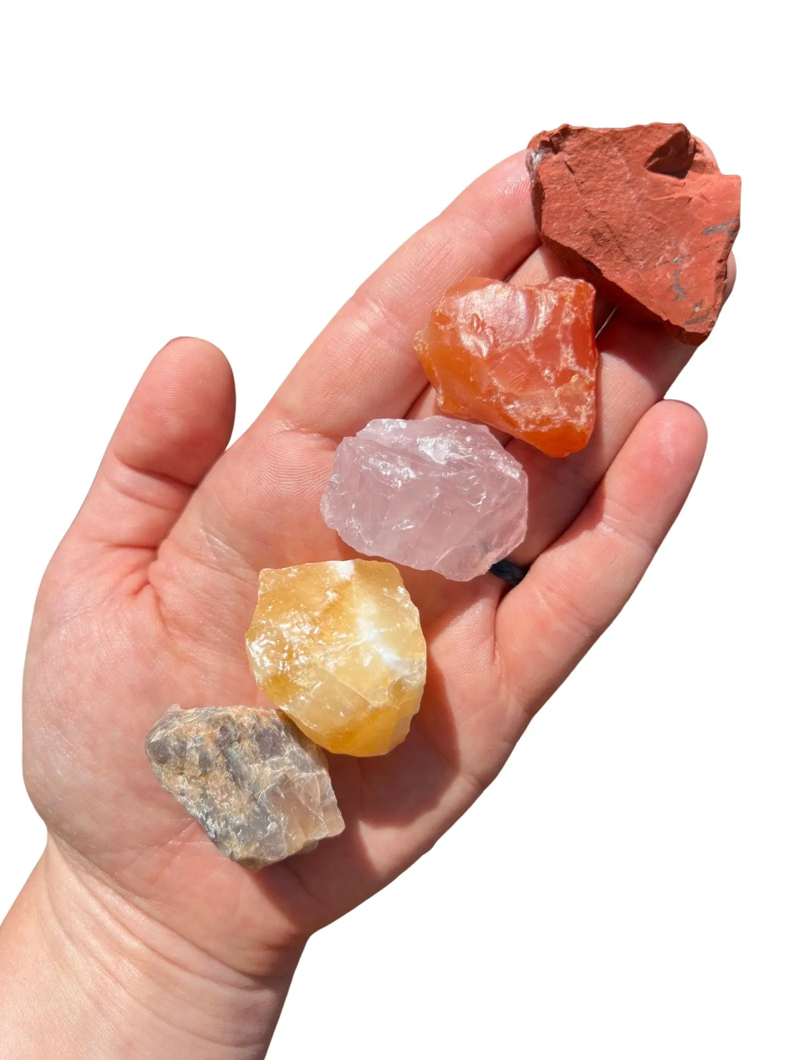 Rough: Carnelian, Rose Quartz, Moonstone, Calcite, Red Jasper