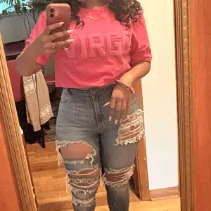 Love this shirt!! I cropped mine to add some shape to my outfit and it turned out perfect. Love the color! The shirt is soft and the letters are real - not screen print.