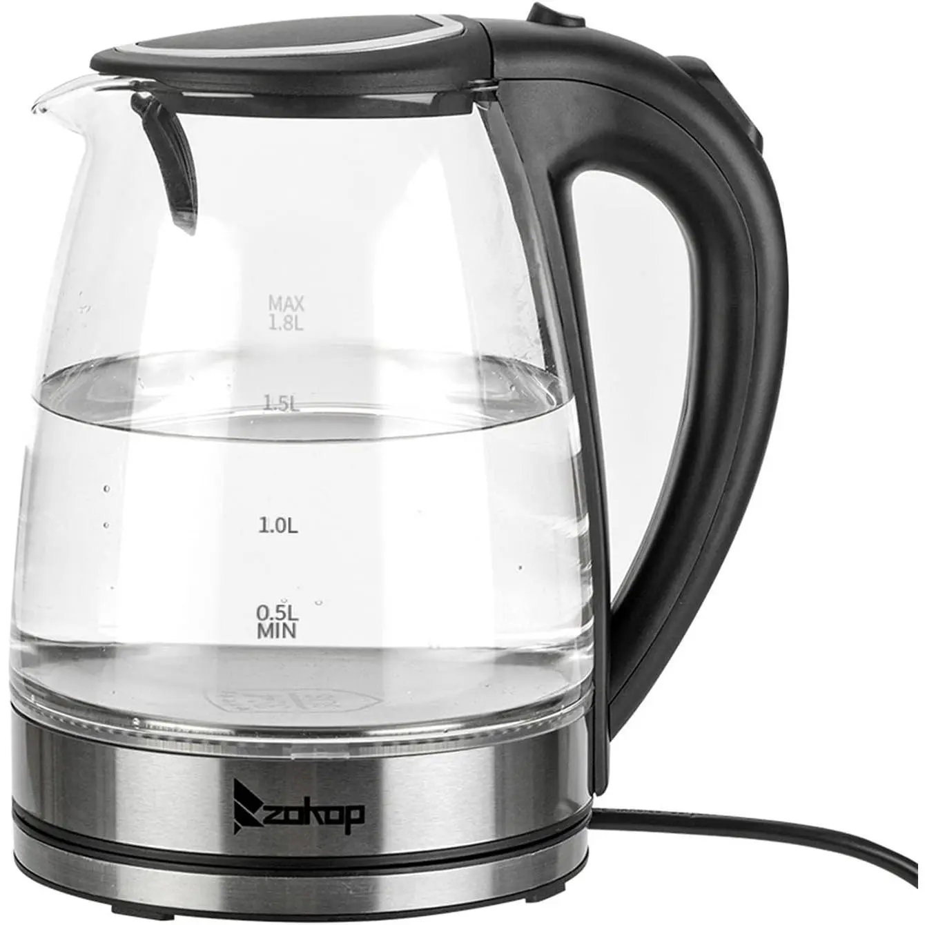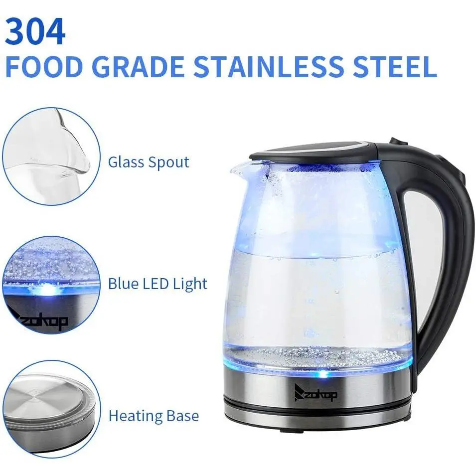 The ZOKOP HD-1857-A 110V 1500W 1.8L Electric Glass Kettle is the perfect blend of elegance and functionality. Not only is this kettle a beautiful addition to any kitchen countertop, but it also boils water efficiently, saving time and energy over the use of conventional stovetop kettles. A halo of blue LED lights beautifully illuminates the pot when it's in use, so it's not only practical, but very attractive to look at. In a matter of minutes, hot water will be ready to use for instant coffee, tea, hot cereal, instant macaroni, soup, or oatmeal.