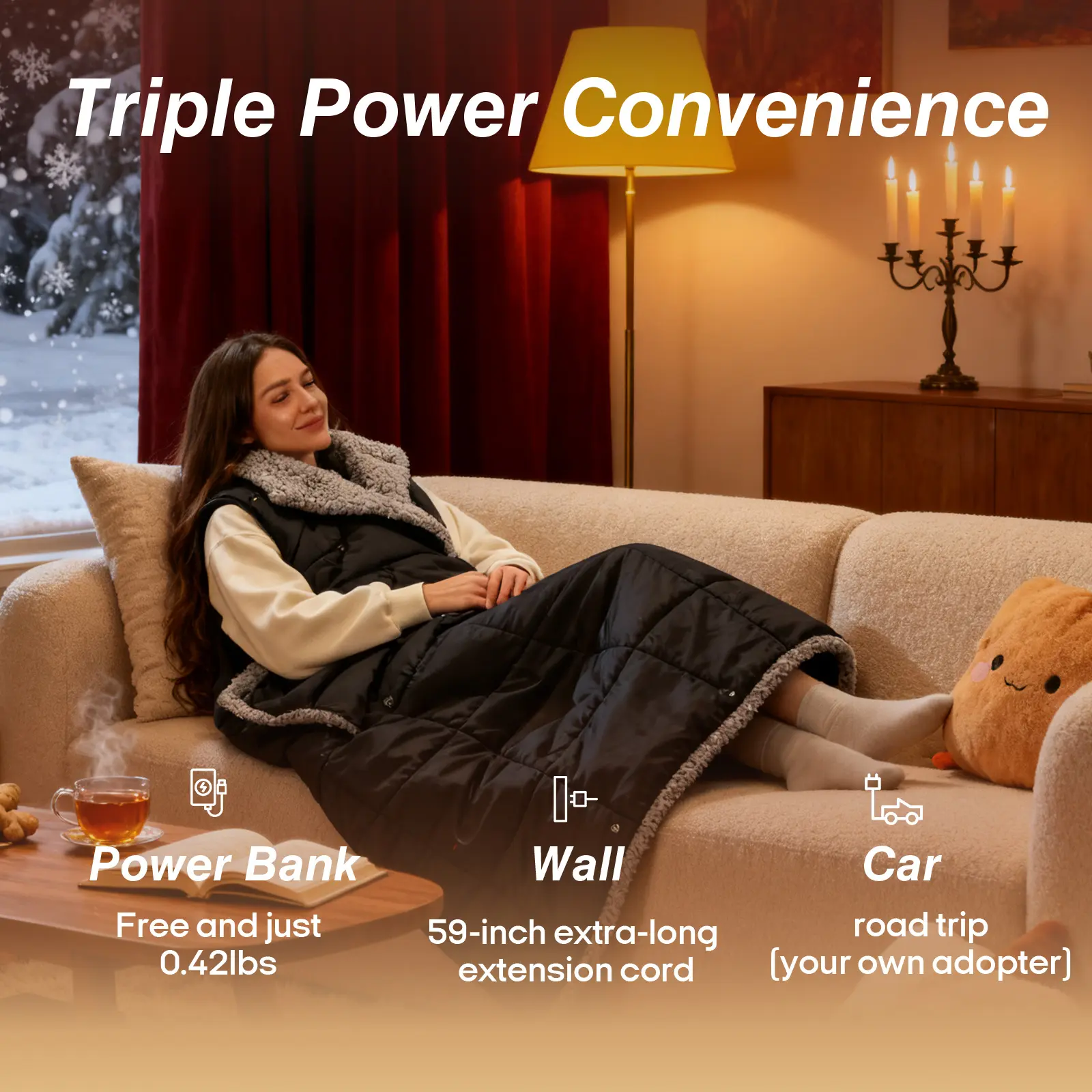 3. True Cordless Freedom: 10,000mAh Power Bank Included Equipped with a UL-certified 10,000mAh portable battery, providing hours of continuous warmth. The blanket features a built-in zippered pocket to securely hold the power bank, allowing you to move freely without wires. Perfect for tailgating, road trips, or staying warm in a cold office without being tethered to a wall.