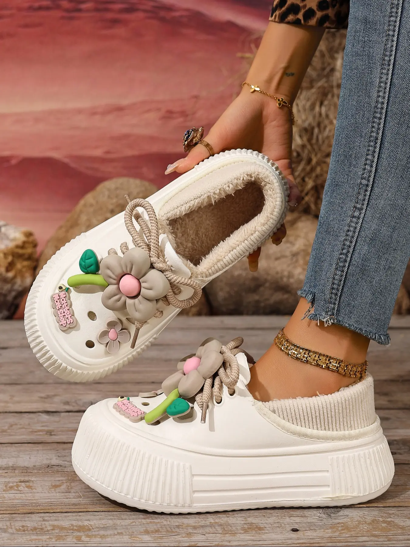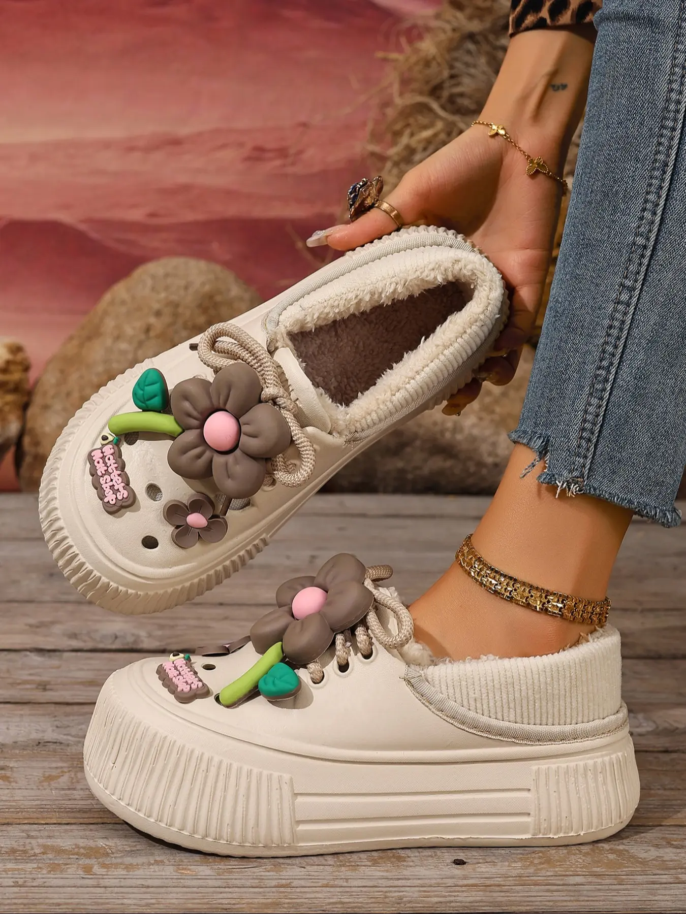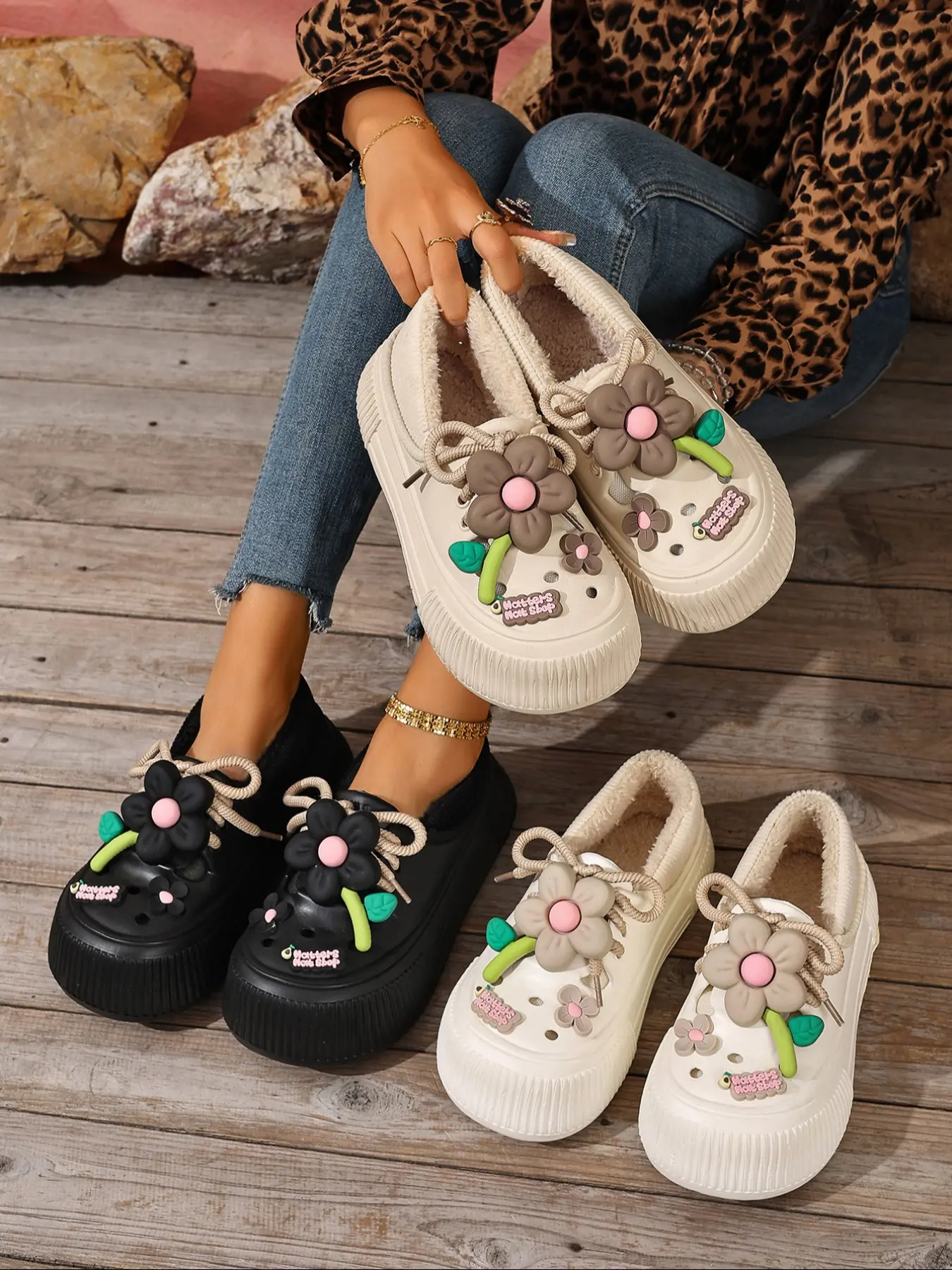 The shoes are cute but the fleece isnt elastic enough to hold your foot in my foot pop up on every step. Im disable cant afford to fall.