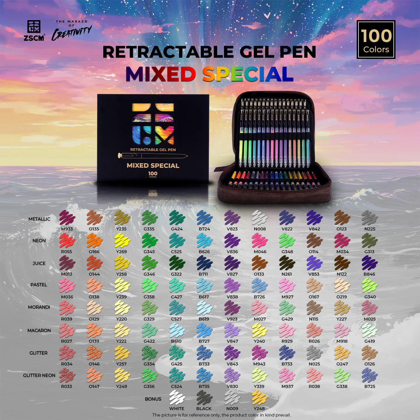 ·This set includes 100 retractable gel pens, organized into 8 color families: Macaron, Pastel, Morandi, Glitter, Metallic, Glitter Neon, Juicy, and Neon, plus black and white. 🌈