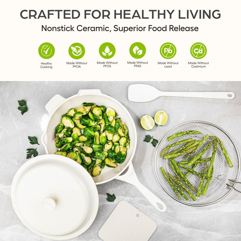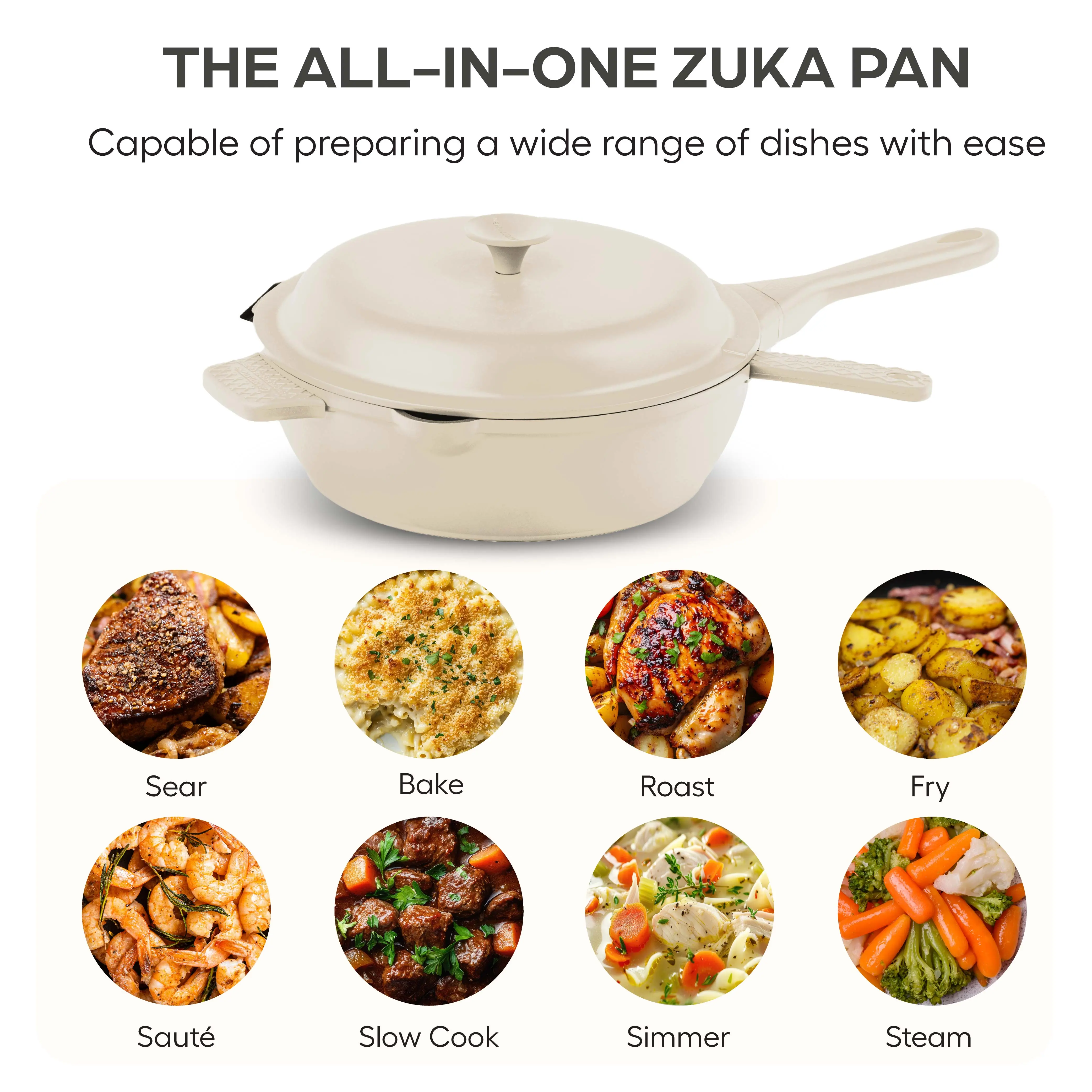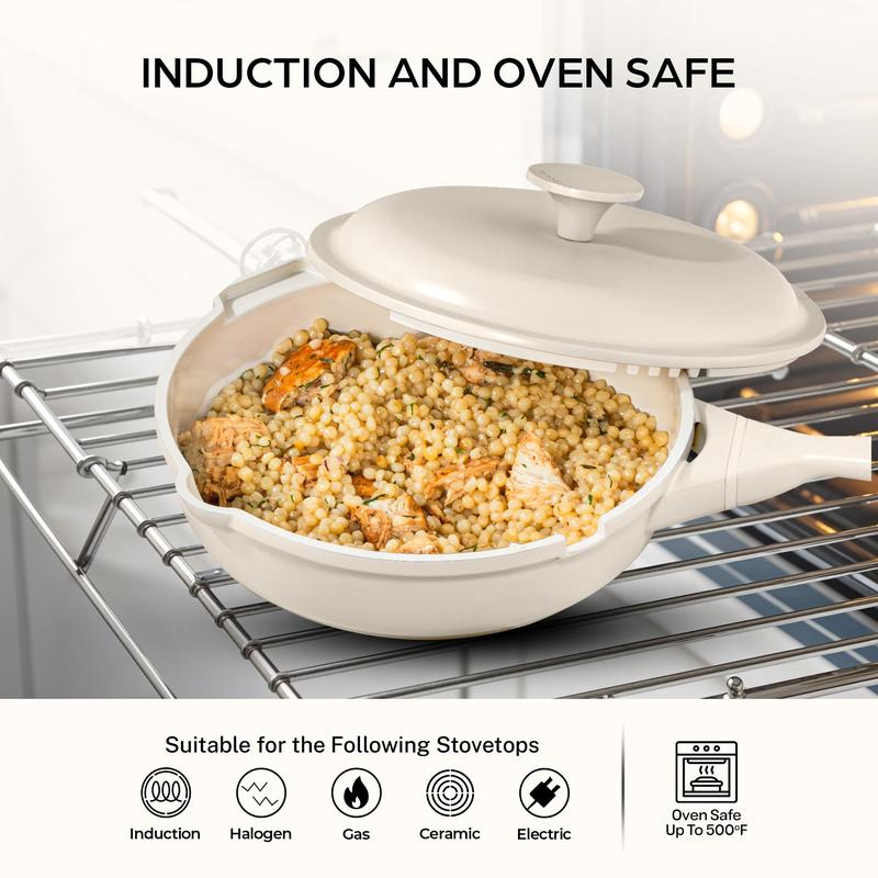 ·Multi-Functional Design: Seamlessly sear, bake, roast, slow cook, deep fry, braise, sauté, steam, boil, and serve—all with one pan.