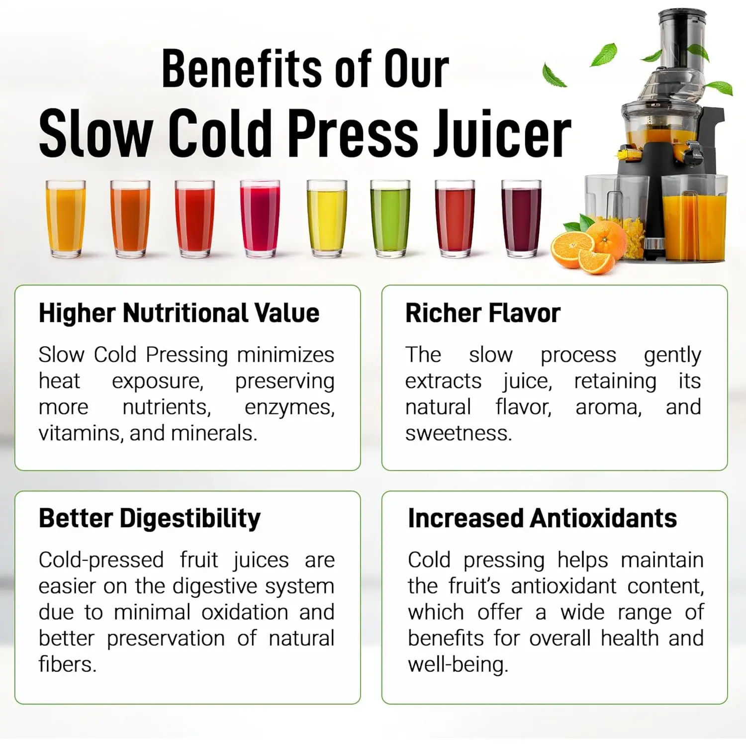 ·Quiet Operation: Designed for quiet juicing, making it ideal for any time of day without disturbing your household.