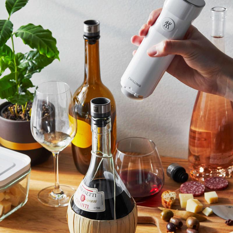 The Fresh & Save vacuum pump is at the heart of the smart storage system by ZWILLING. The sleek, quiet, cordless vacuum pump extracts the air out of our vacuum containers and bags in just seconds and preserves aromas and vitamins. It stops automatically once a sufficient vacuum has been created. Equipped with a long-life lithium-ion battery, the pump can be charged quickly using the included USB via the charging socket located on the pump.