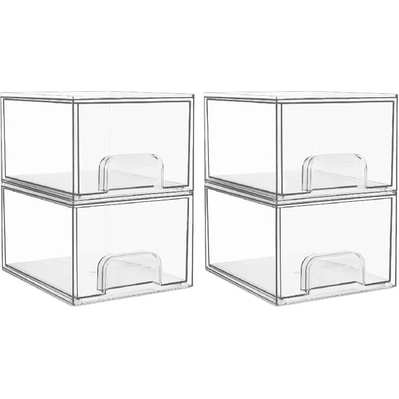 [Stackable Design] Come with 4 drawer storage organizers, the outside box measures 7.5"D x 6"W x 4.4"H,the drawer measures 7.1"D x 5.6"W x 3.7"H,it is usable size.Please measure the space of using before purchasing.The storage containers are stackable, vertical storage will save a lot of space.You can also use them side by side.Put your small objects on top of acrylic bins to make your countertop space more tidy.